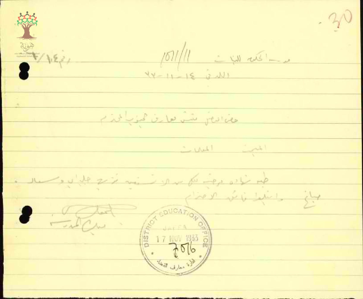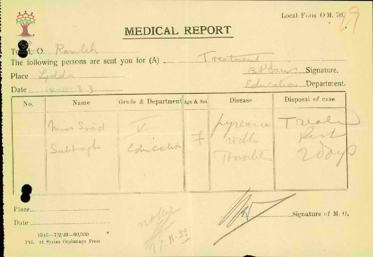 رسالة من مديرة مدرسة بنات اللد إلى مفتش المعارف تخبره بغياب المعلمة سعاد صباغ بسبب المرض مرفقة التقرير الطبي