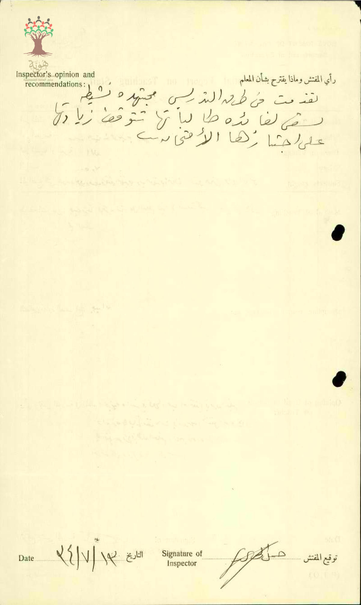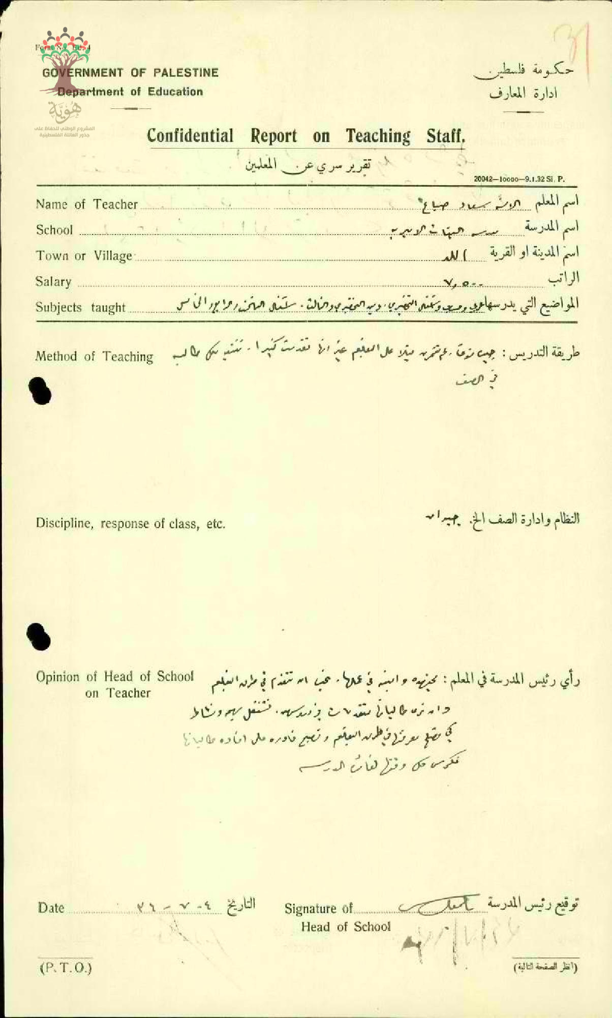 تقرير تفصيلي عن أداء المعلمة سعاد صباغ في مدرسة بنات اللد سنة 1934