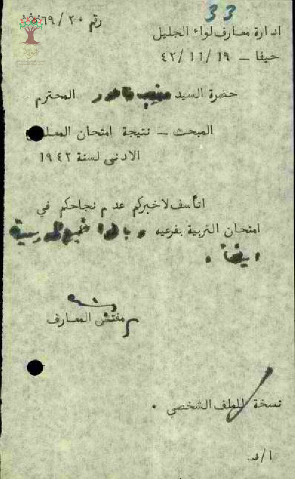 رسالة صادرة عن مفتش المعارف يخبر المعلم منيب فاعور بعدم نجاحه في امتحان التربية