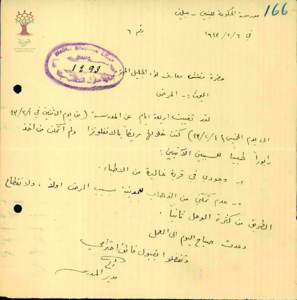 رسالة من المعلم زكي ديب الى مفتش المعارف بخصوص تغيبه وعودته الى العمل