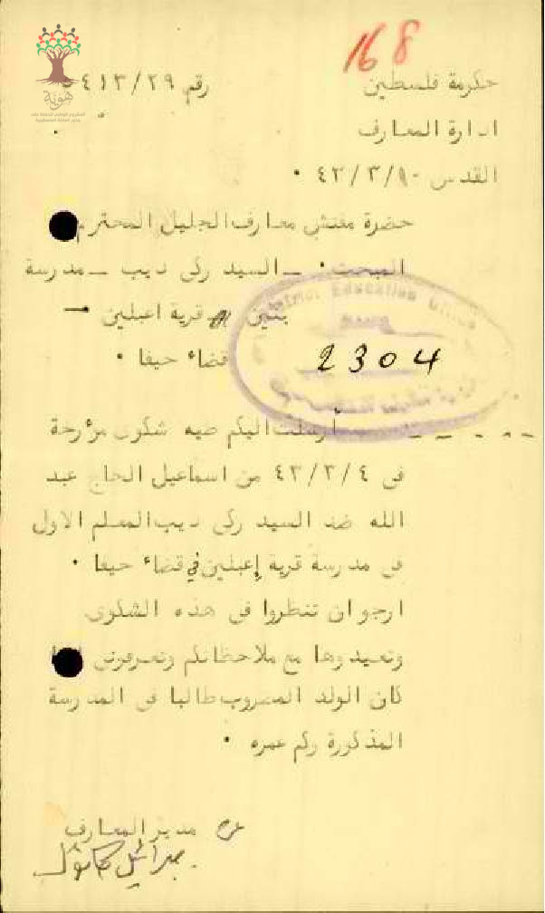 رسالة من مدير المعارف الى مفتش المعارف بخصوص شكوى مقدمة ضد المعلم زكي ديب