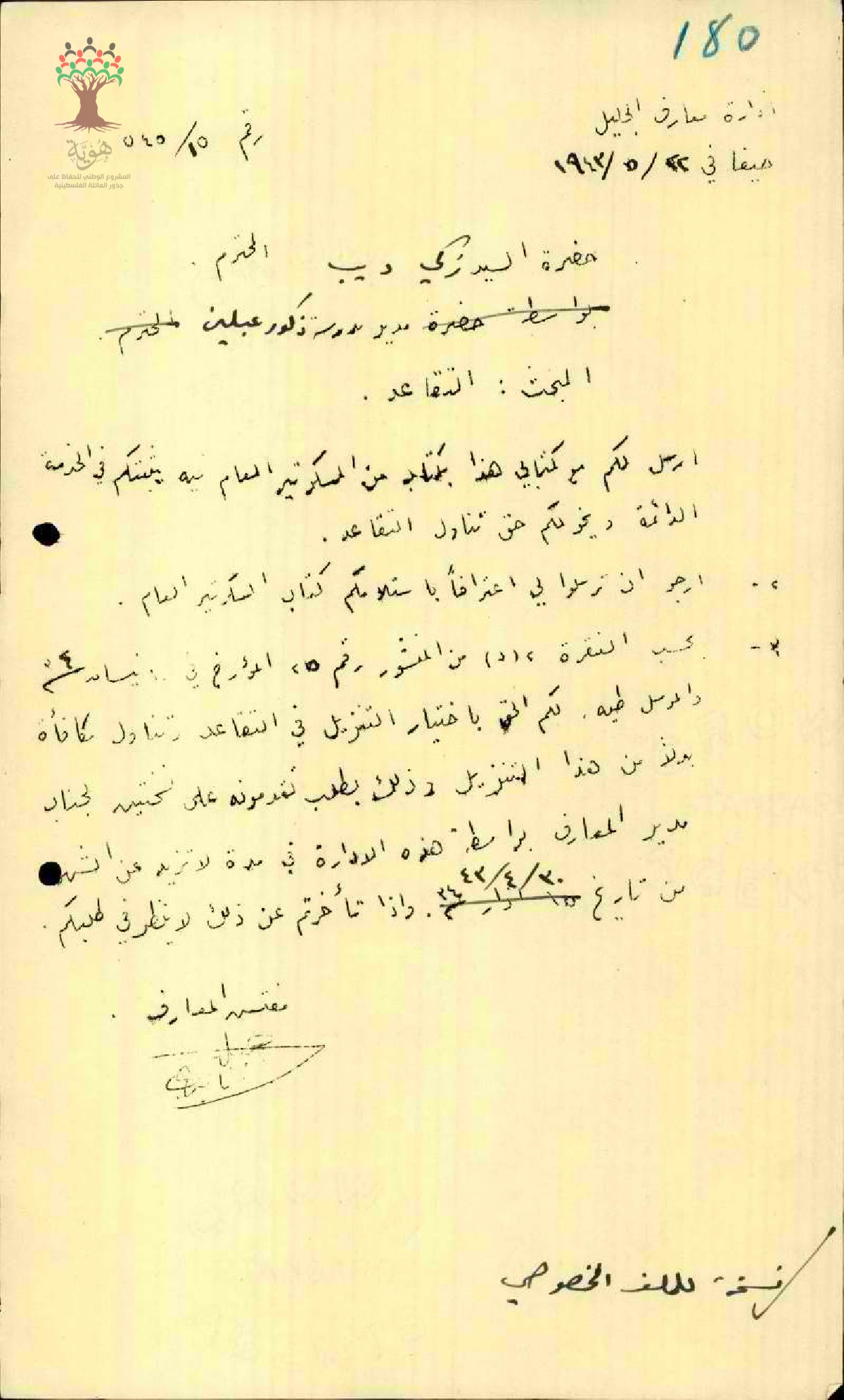 رسالة من مفتش المعارف الى المعلم زكي ديب بخصوص كتاب السكرتير العام لتثبيته حتى تناول التقاعد