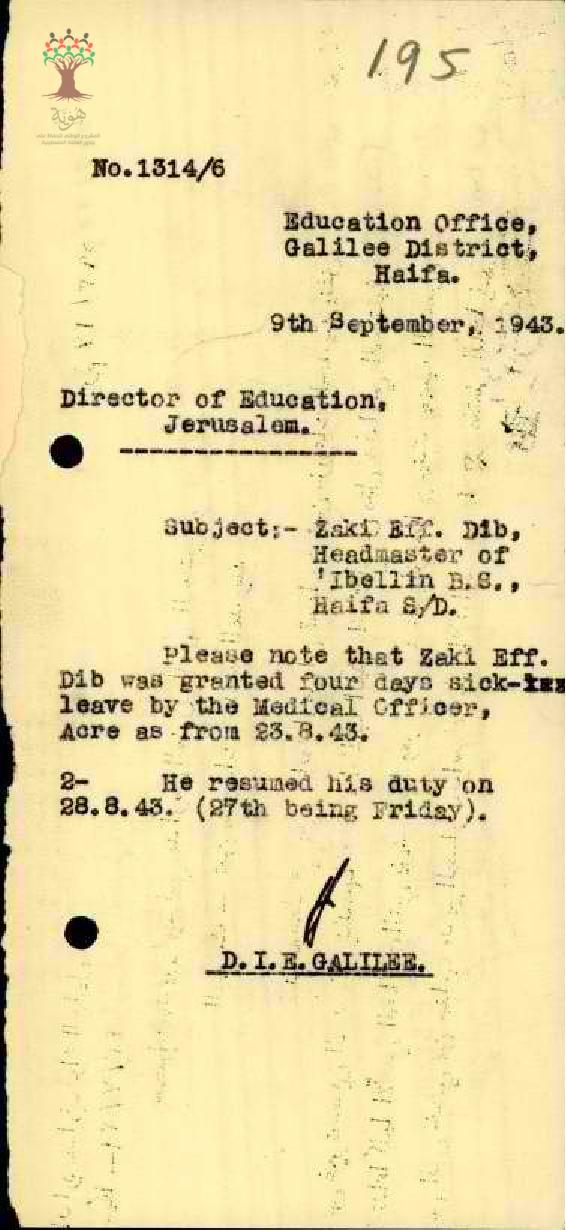 رسالة من مفتش المعارف الى مدير المعارف بخصوص اجازة مرضية للمعلم زكي ديب وعودته للعمل