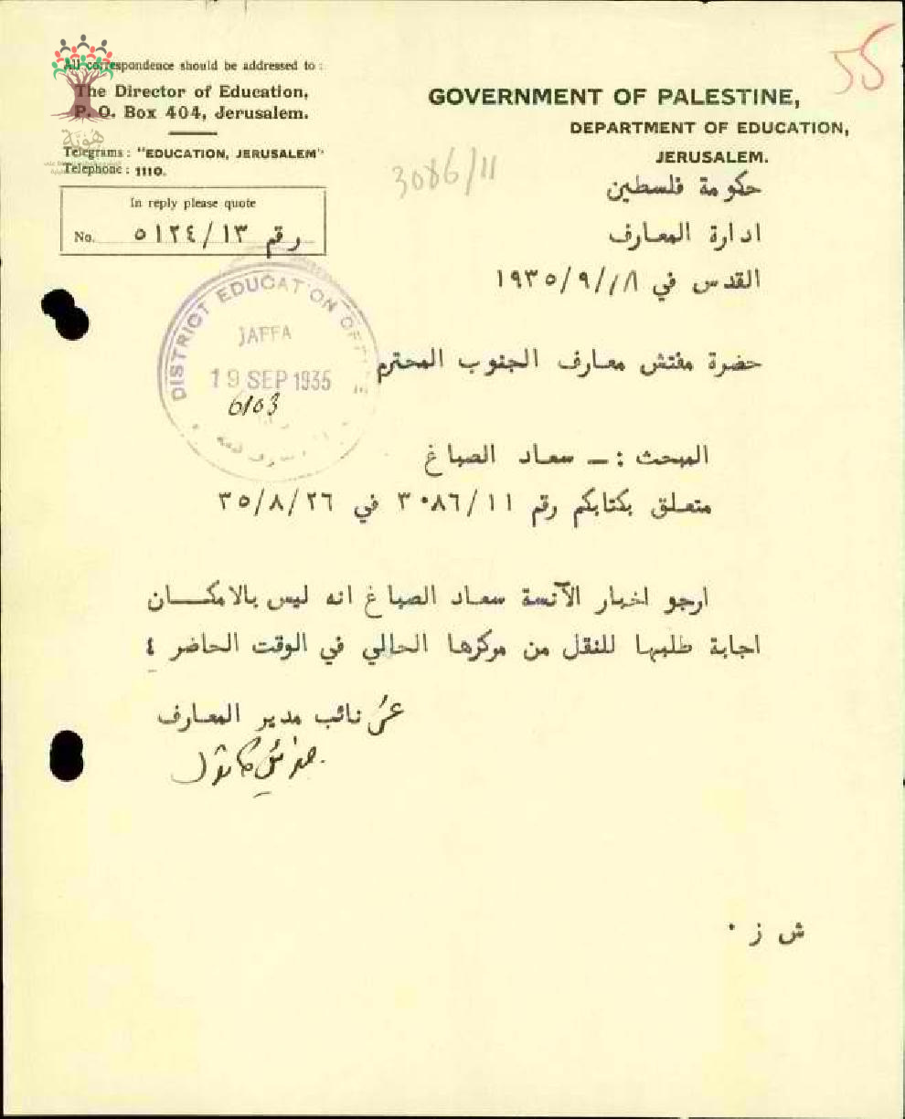 رسالة من مدير المعارف إلى مفتش المعارف يخبره بعدم امكانية نقل المعلمة سعاد صباغ من مركزها الحالي