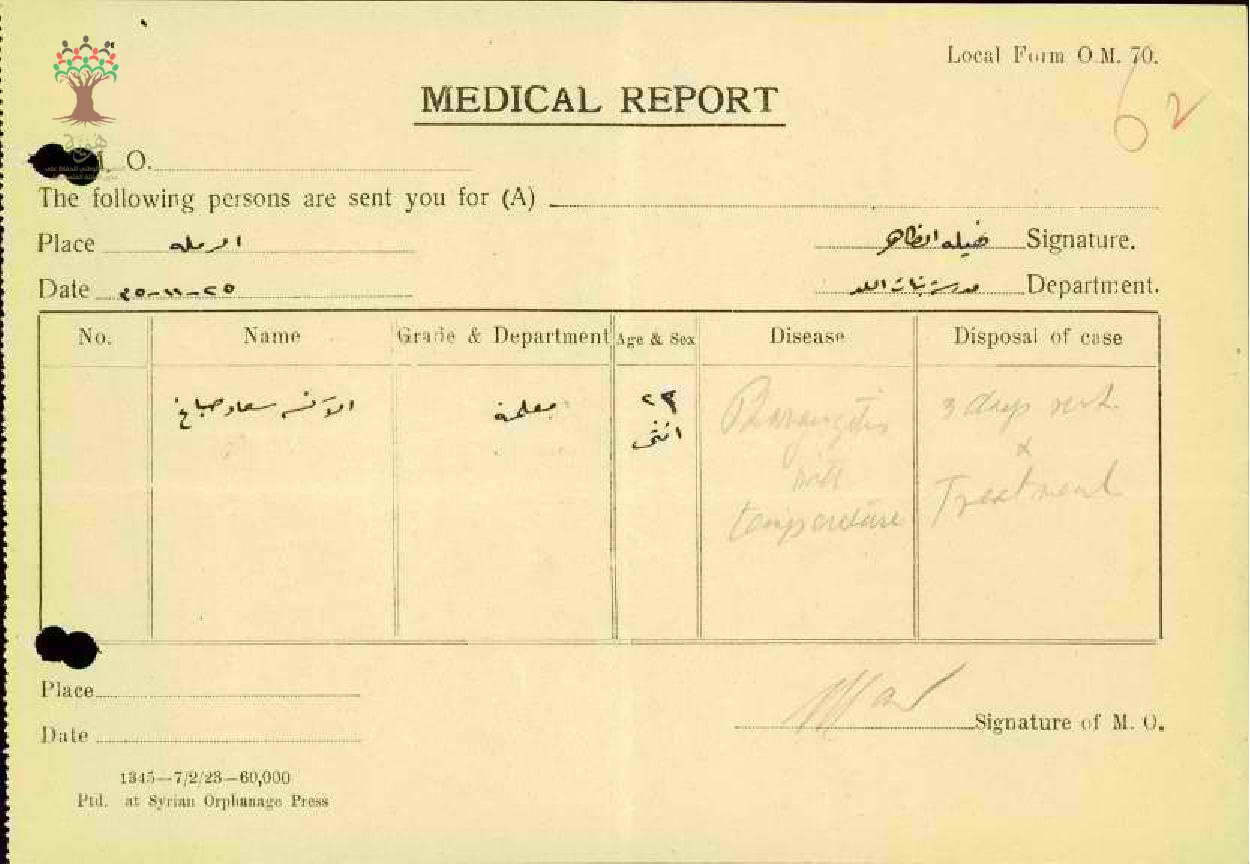 رسالة من مديرة مدرسة بنات اللد إلى مفتش المعارف تخبره بغياب المعلمة سعاد صباغ بموجب تقرير طبي