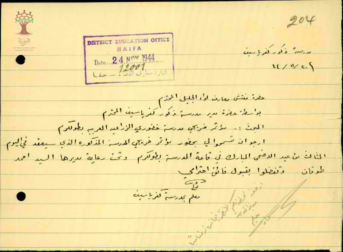 رسالة من المعلم زكي ديب الى مفتش المعارف يطلب اجازة لحضور مؤتمر خريجي مدرسة خضوري الزراعية