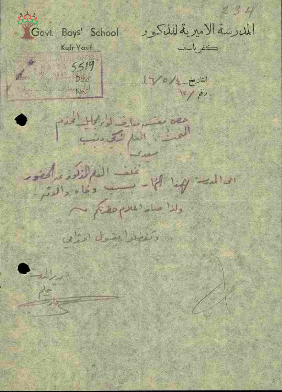 رسالة من مدير مدرسة كفر ياسيف الى مفتش المعارف بخصوص تغيب المعلم زكي ديب بسبب وفاة والدته