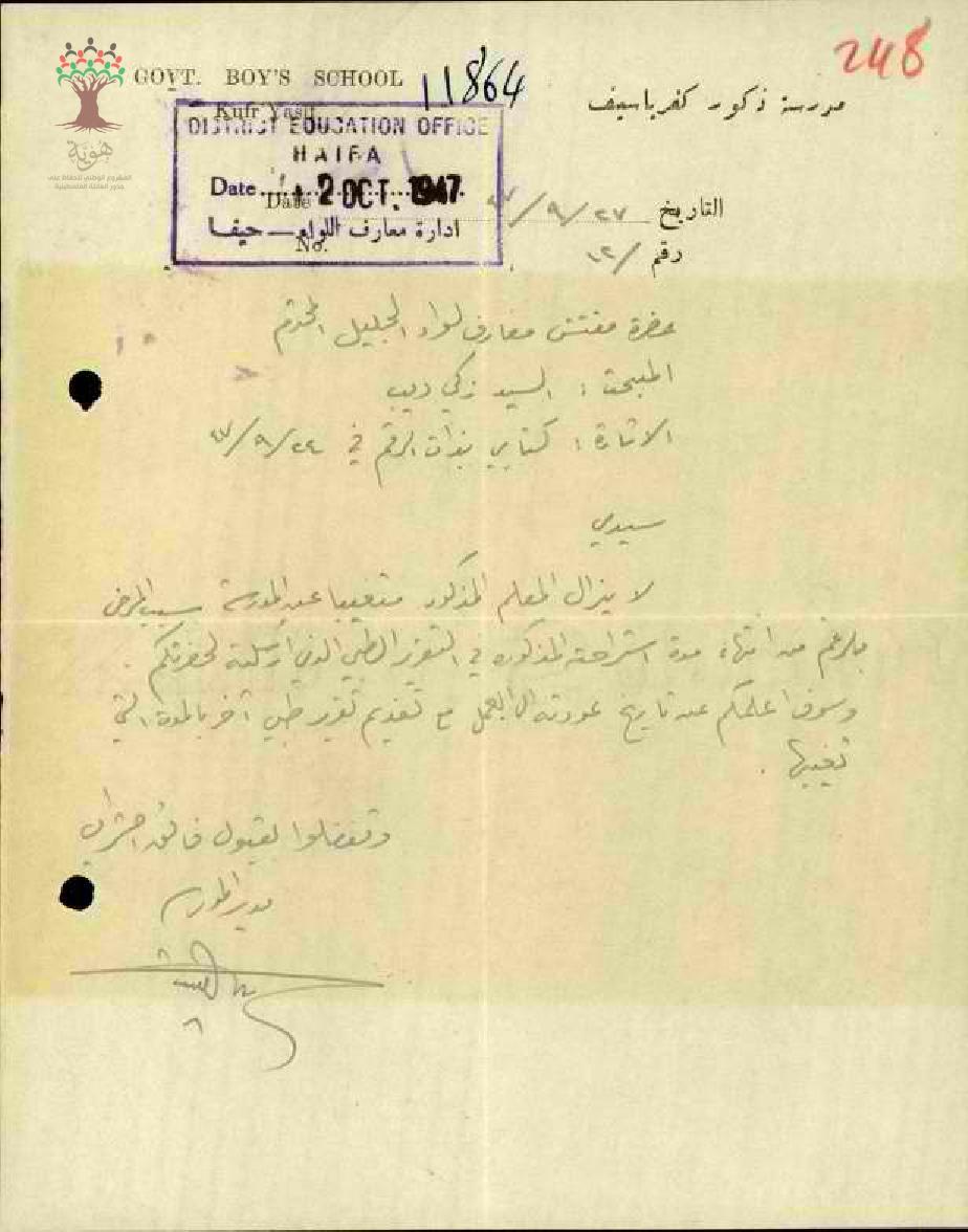 رسالة من مدير مدرسة كفر ياسيف الى مفتش المعارف يخبره بأن المعلم زكي ديب ما زال متغيبا عن المدرسة