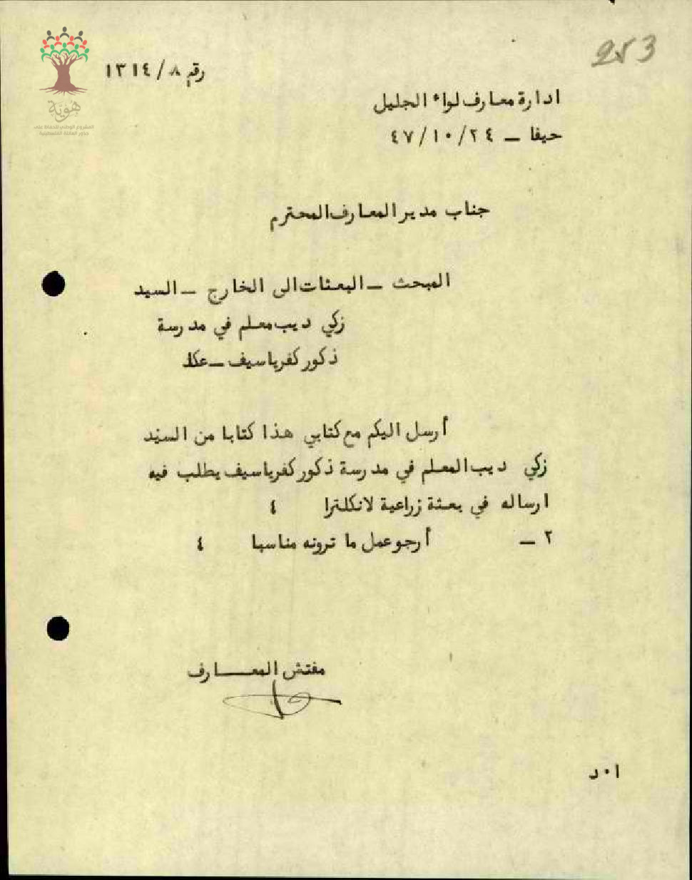 رسالة من مفتش المعارف الى مدير المعارف ينقل رغبة المعلم زكي ديب ارساله في بعثة الزراعة الى انكلترا