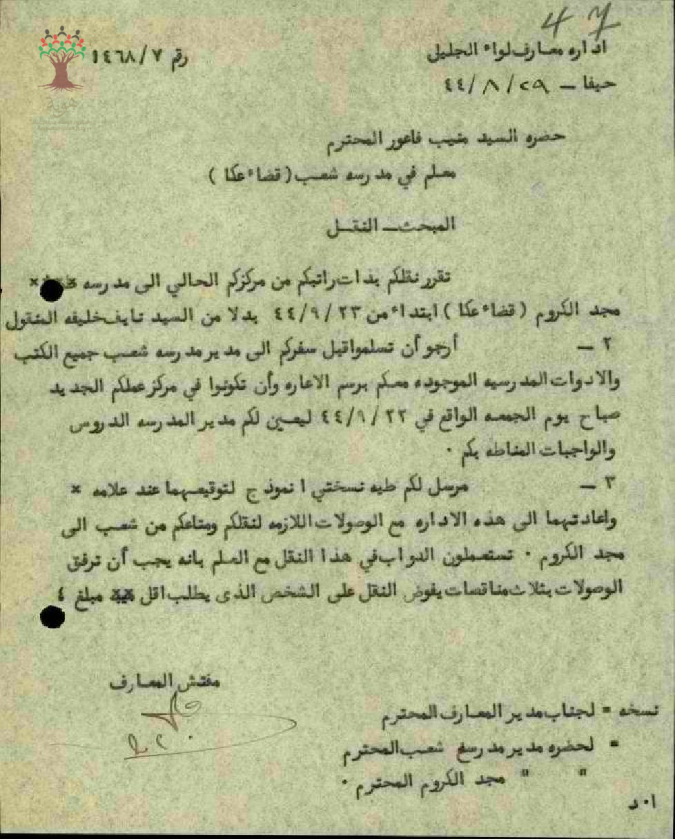 قرار نقل المعلم منيب فاعور من مدرسة شعب الى مدرسة مجد الكروم. القرار صادر عن مفتش المعارف