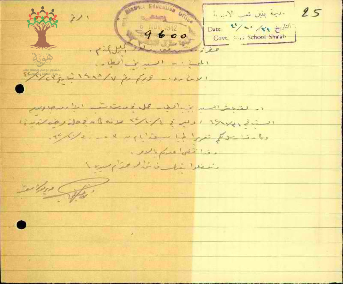 رساله من مدير مدرسة بنين شعب الى حضرة مفتش معارف لواء الجليل بخصوص المعلم نجيب الطيار وقد بدا عمله في مدرسة شعب يوم السيت في 13/10/42