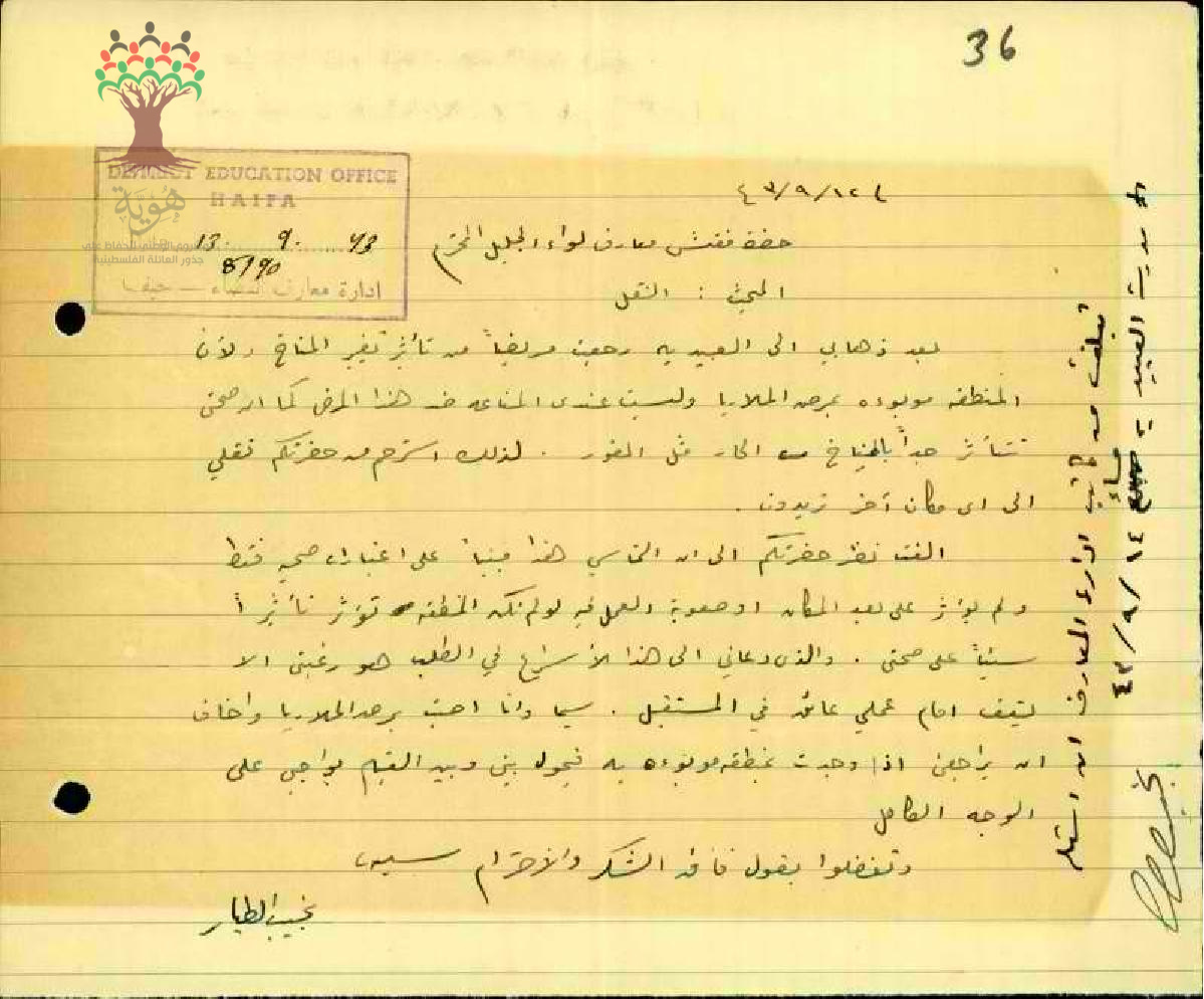 رساله من المعلم نجيب الطيار الى حضرة مفتش معارف لواء الجليل بخصوص رجعته مريض من تاثير تغير المناخ