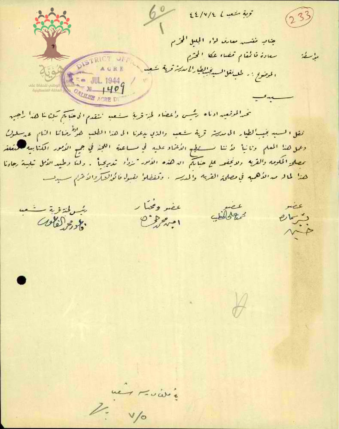 رساله من مدير مدرسة شعبا الى مفتش معارف لواء الجليل بخصوص نقل المعلم نجيب الطيار الى مدرسة شعب والموقعين على هذا طلب ..عضو محمد علي الخطيب عضو امجد محمد خير و رئيس لجنتة قريه شعب فاعور محمد