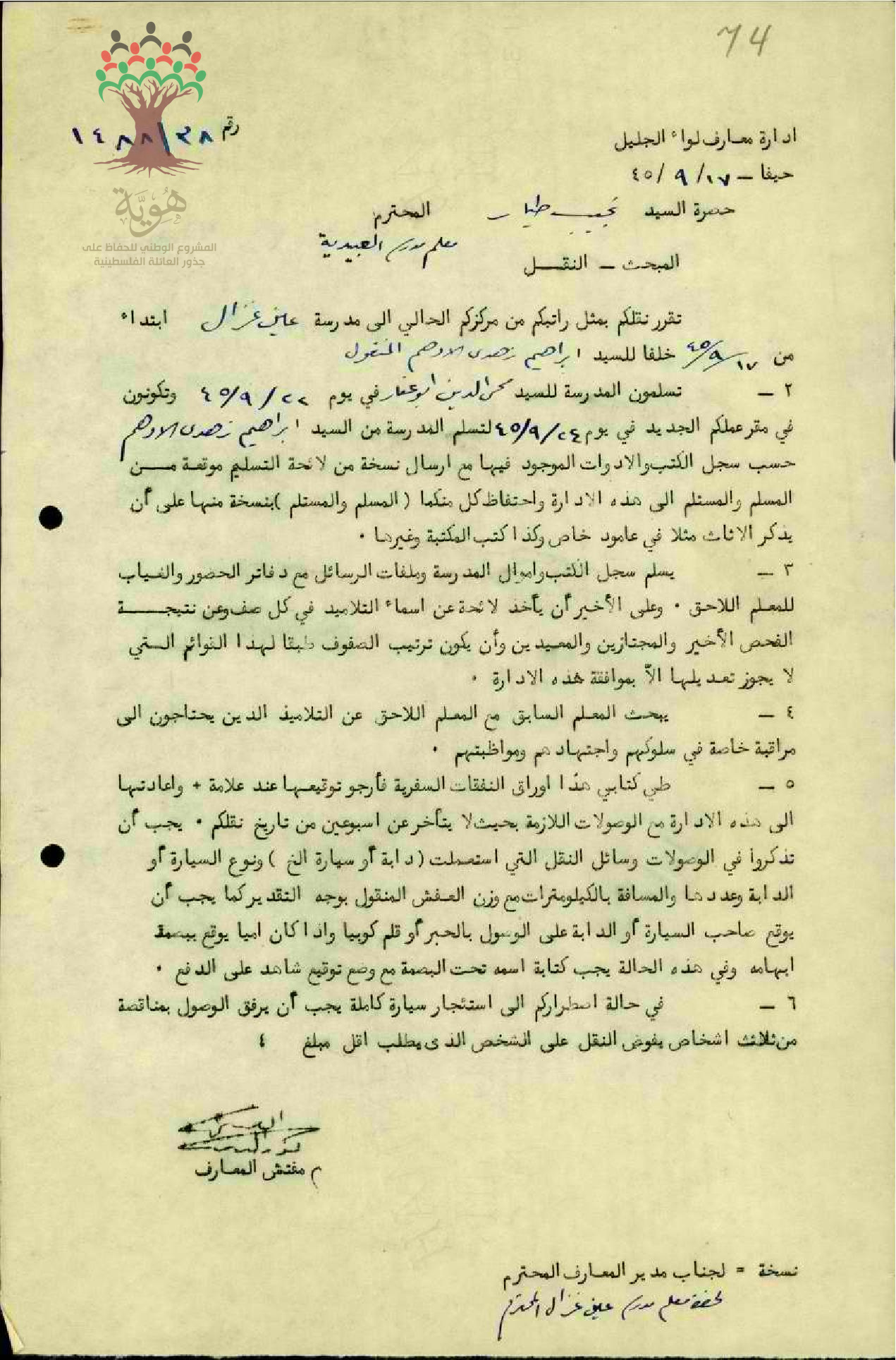 رسالة من مفتش المعارف إلى المعلم نجيب الطيار بخصوص النقل