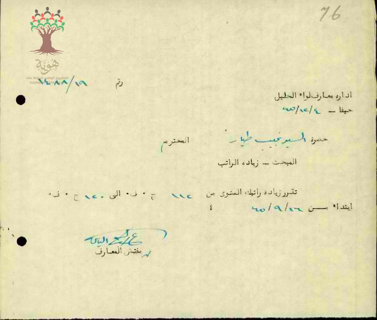 رسالة من مفتش المعارف إلى ادارة المعارف بخصوص زيادة الراتب للمعلم نجيب الطيار