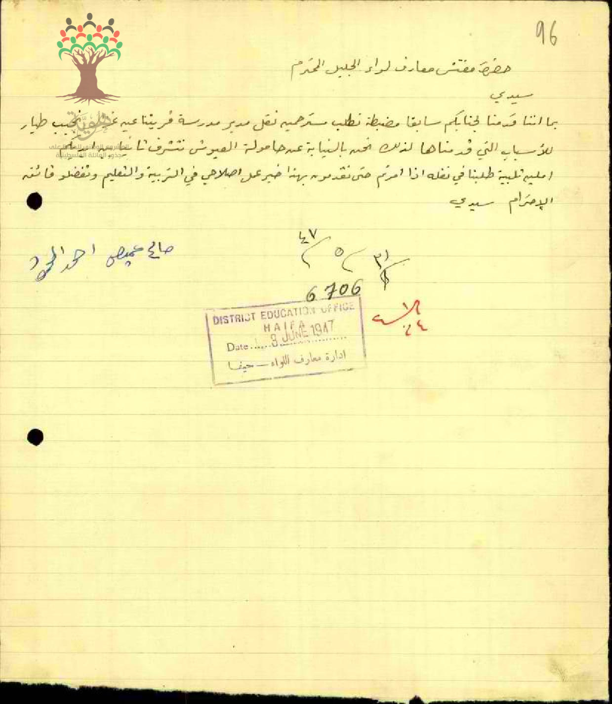 رسالة من صالح عميص أحمد المحمود إلى مفتش معارف الجليل بخصوص طلب نقل المعلم من مدرسة عين غزال إلى مدرسة أخرى