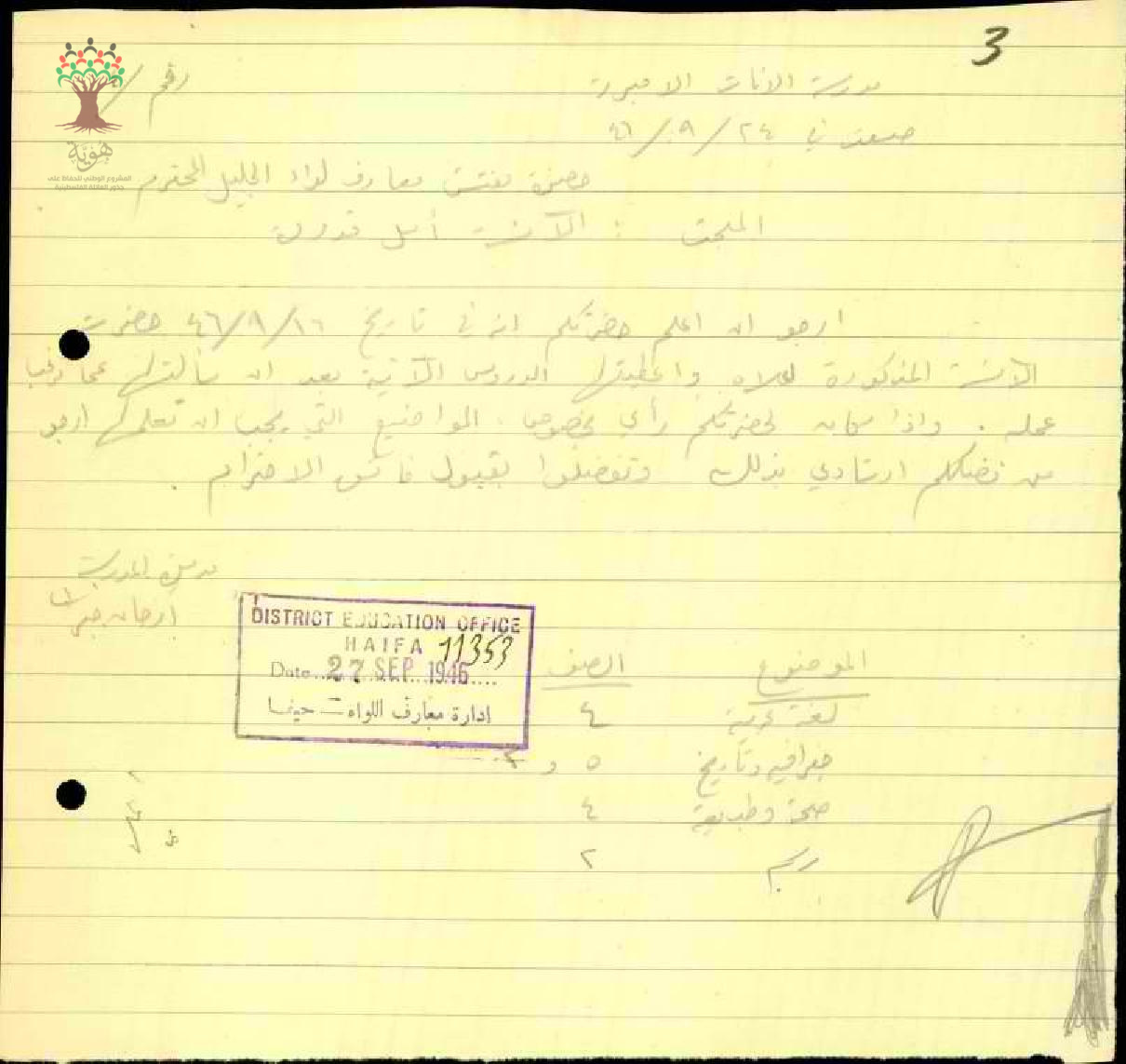 رسالة من مديرة مدرسة صفد الى مفتش المعارف لتخبره بأن المعلمة أمل صلاح الدين قد باشرت العمل