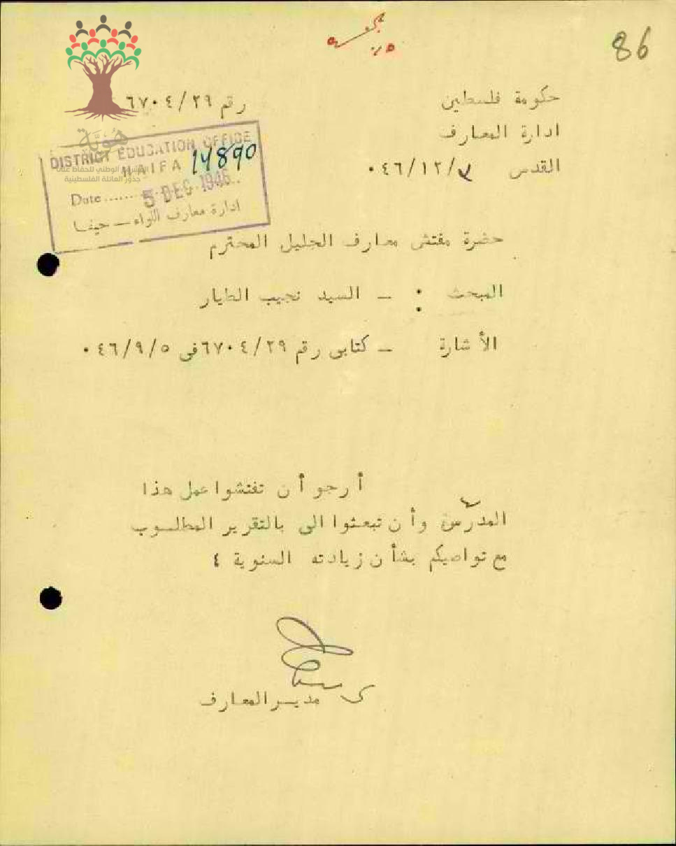 رسالة من مدير المعارف إلى مفتش معارف لواء الجليل بخصوص المعلم نجيب الطيار تفتيش عمله والزيادة السنوية له