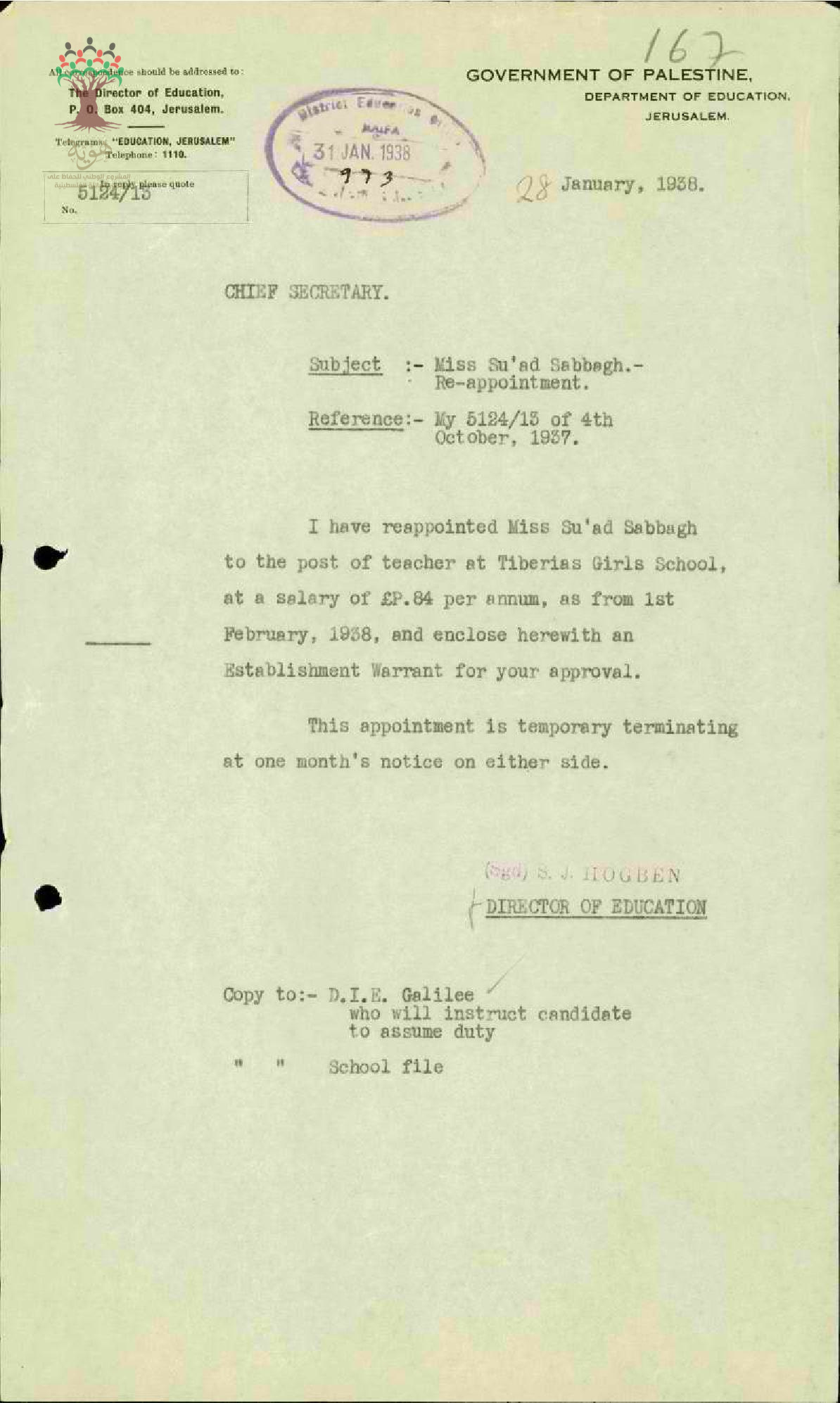 رسالة من مدير المعارف إلى السكرتير العام بحث معه إعادة تعيين المعلمة سعاد صباغ في الإدارة