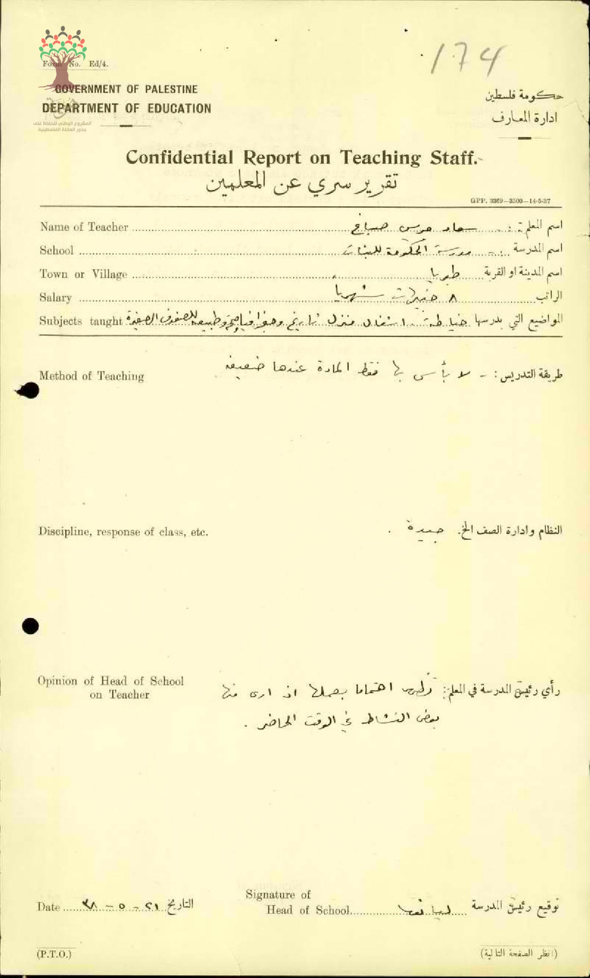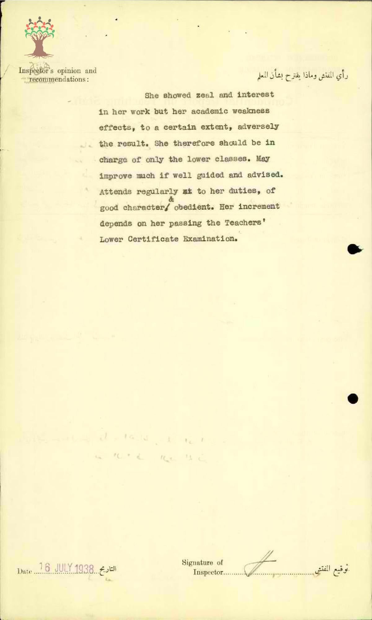 تقرير تفصيلي عن أداء المعلمة سعاد صباغ في مدرسة طبريا سنة 1938