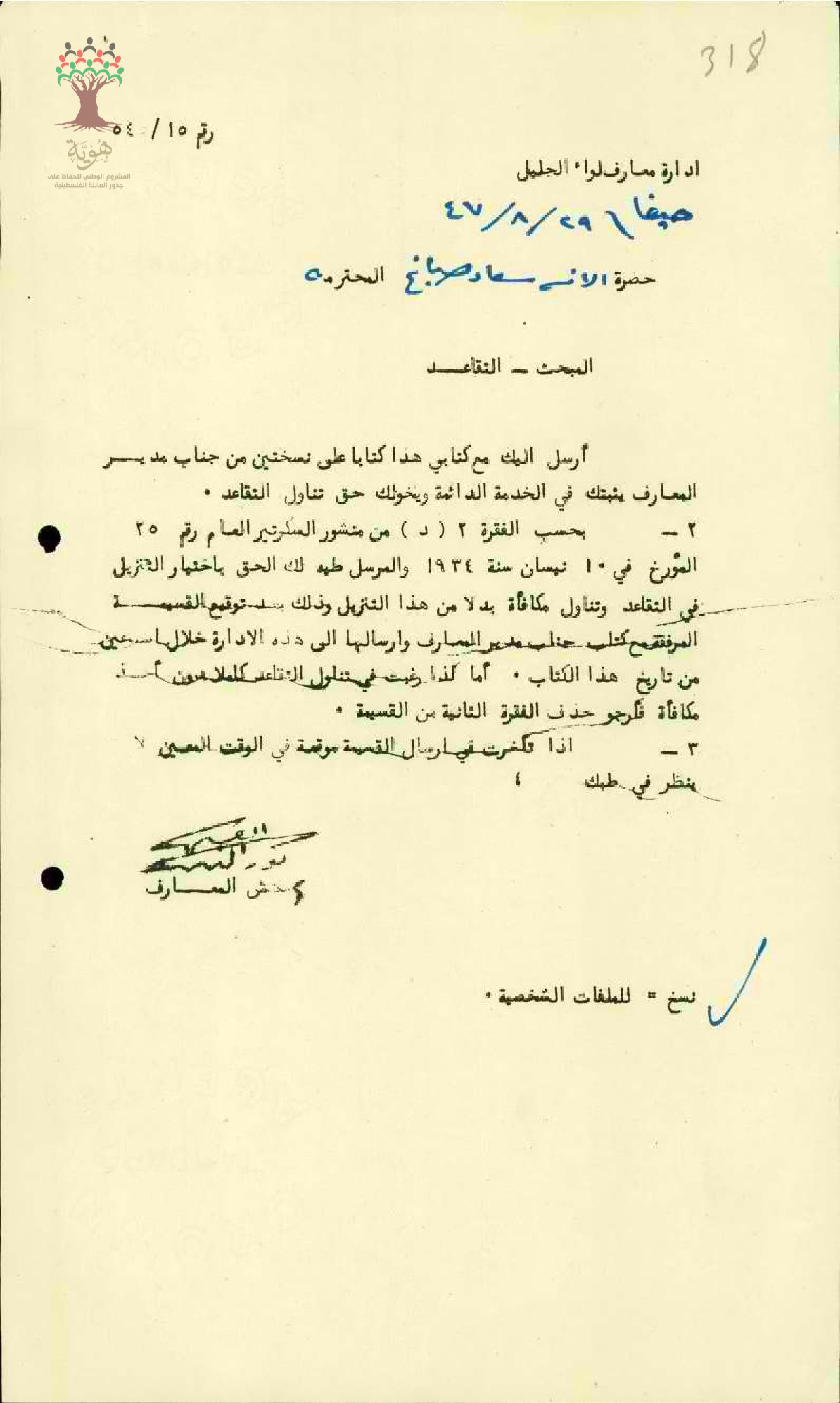 رسالة من مفتش المعارف إلى المعلمة سعاد صباغ يبحث معها أمر التقاعد