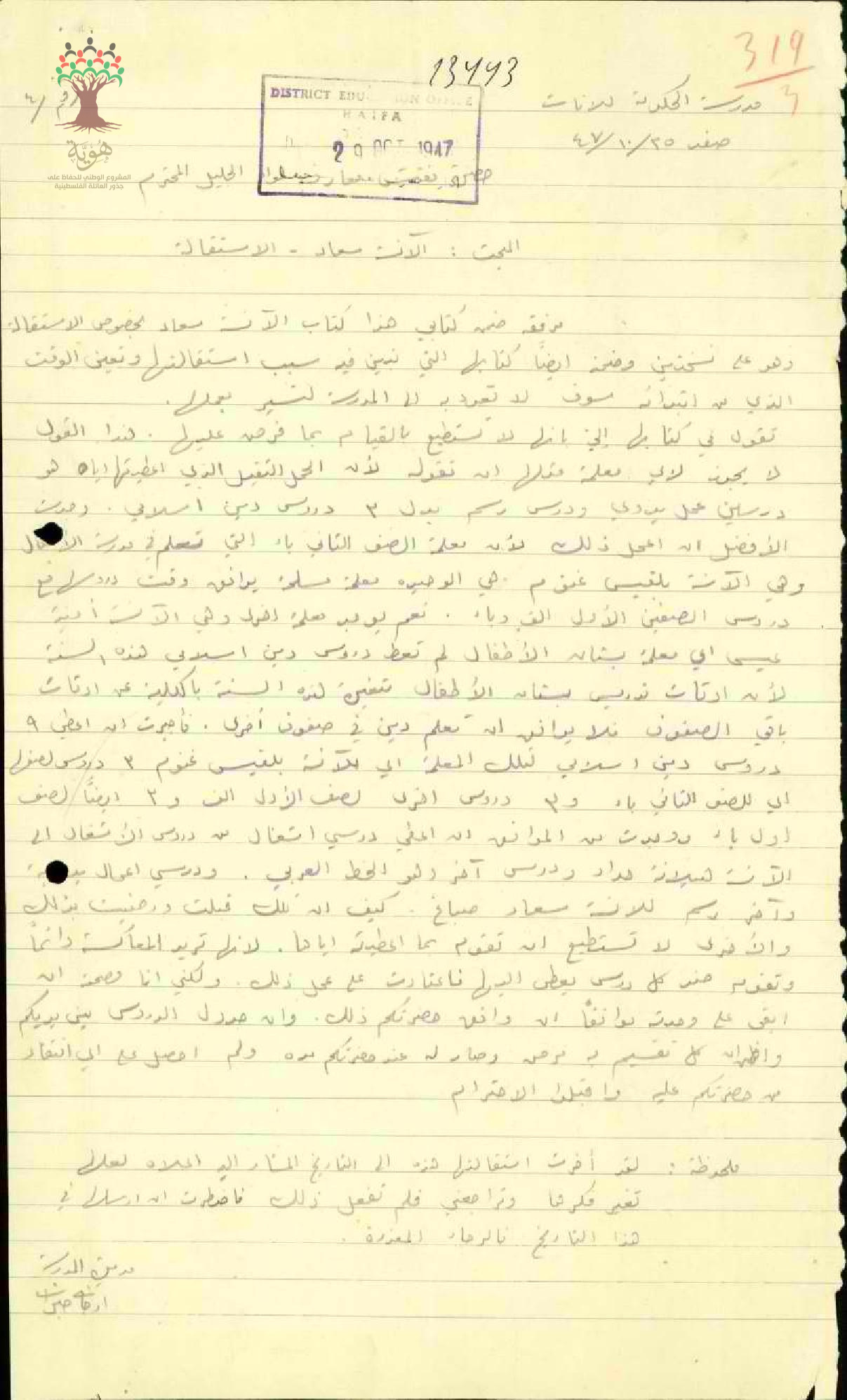 رسالة من مديرة مدرسة صفد إلى مفتش المعارف تقدم فيها استقالة المعلمة سعاد صباغ مع ذكر الأسباب