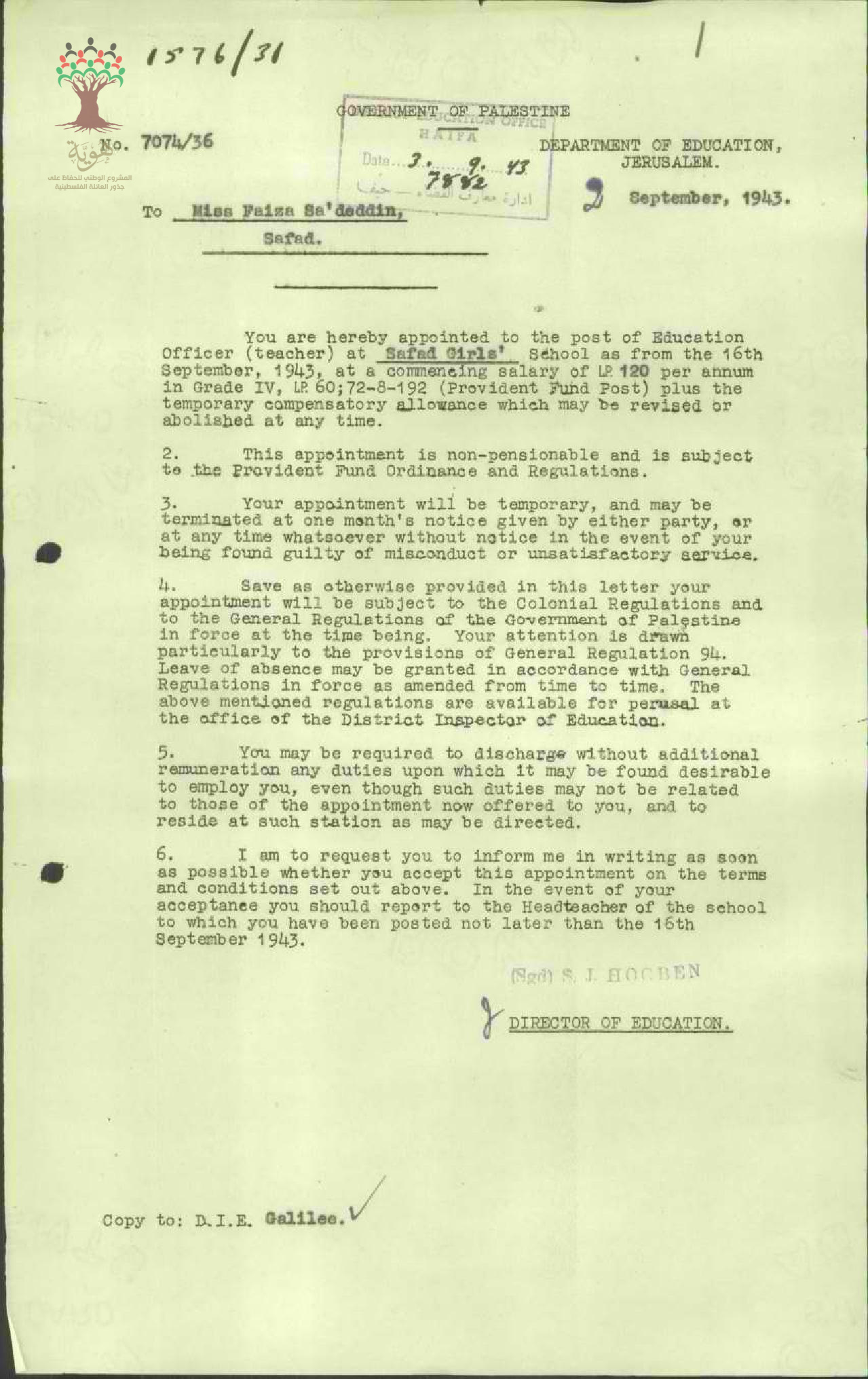 تعيين المعلمة فايزة سعد الدين في مدرسة صفد للبنات