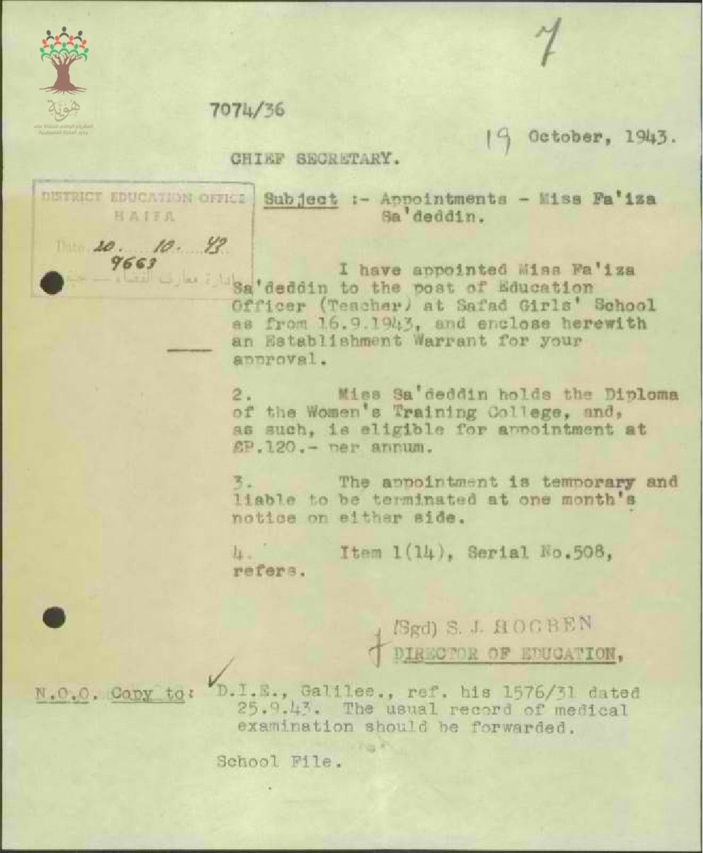 رسالة من مدير المعارف الى رئيس السكرتارية بخصوص تعيين المعلمة فايزة سعد الدين