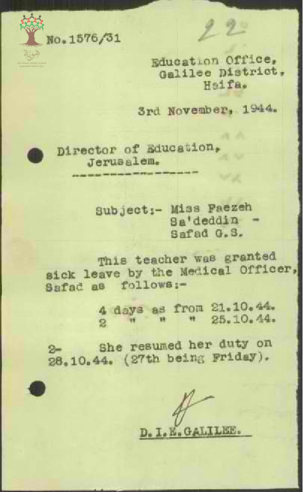 رسالة من مفتش المعارف الى مدير المعارف بخصوص اجازة مرضية للمعلمة فايزة سعد الدين وعودتها الى العمل