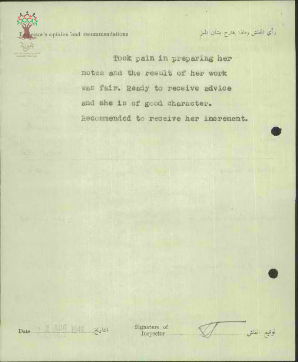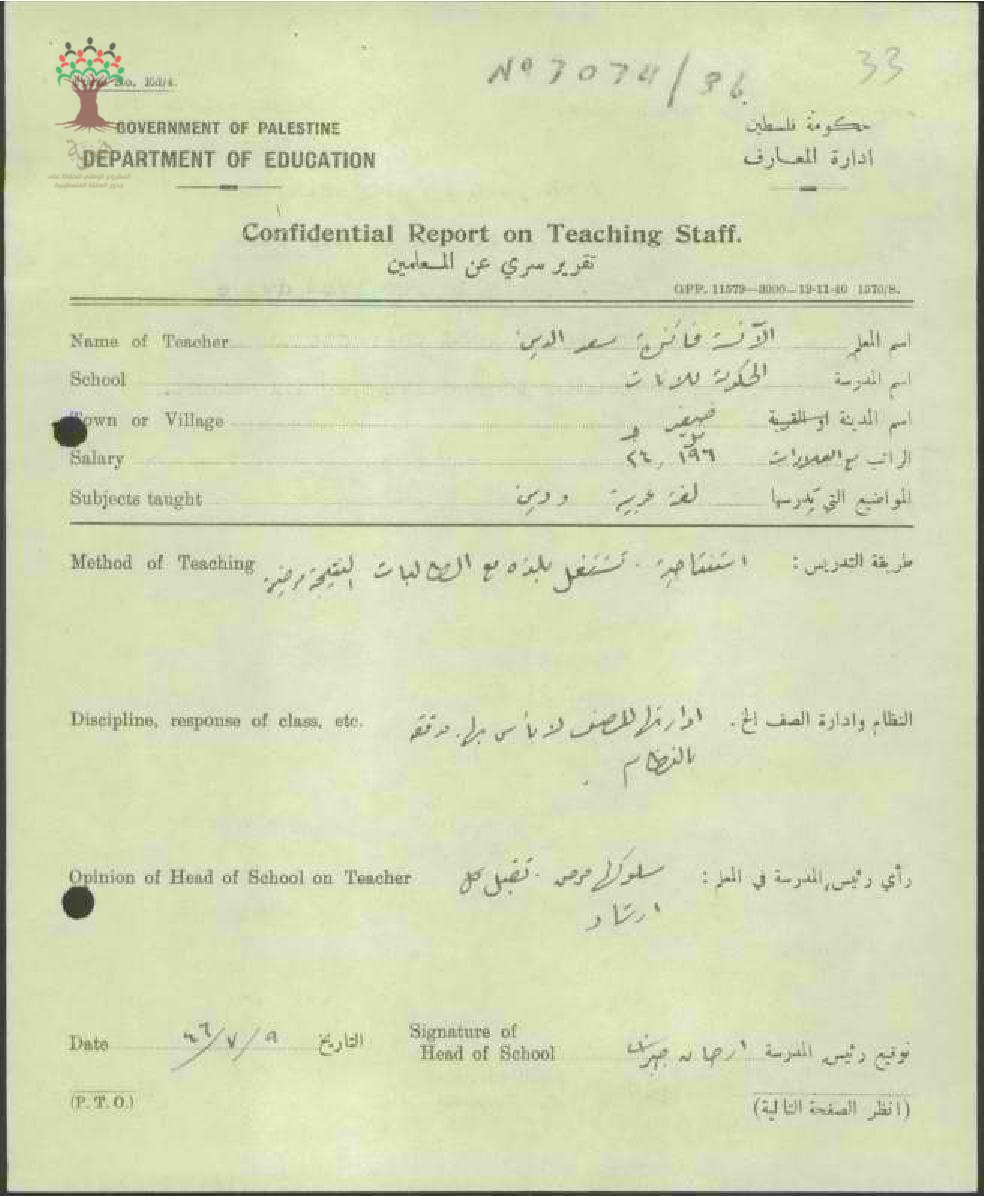 تقرير تفصيلي عن أداء المعلمة فايزة سعد الدين في مدرسة صفد للإناث سنة 1946