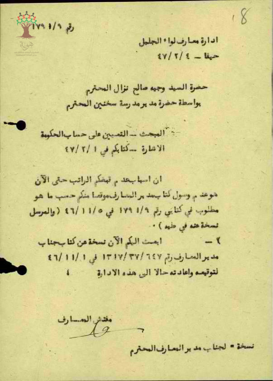 رسالة من مفتش المعارف الى المعلم وجيه نزال يطلعه على أسباب تأخر راتبه