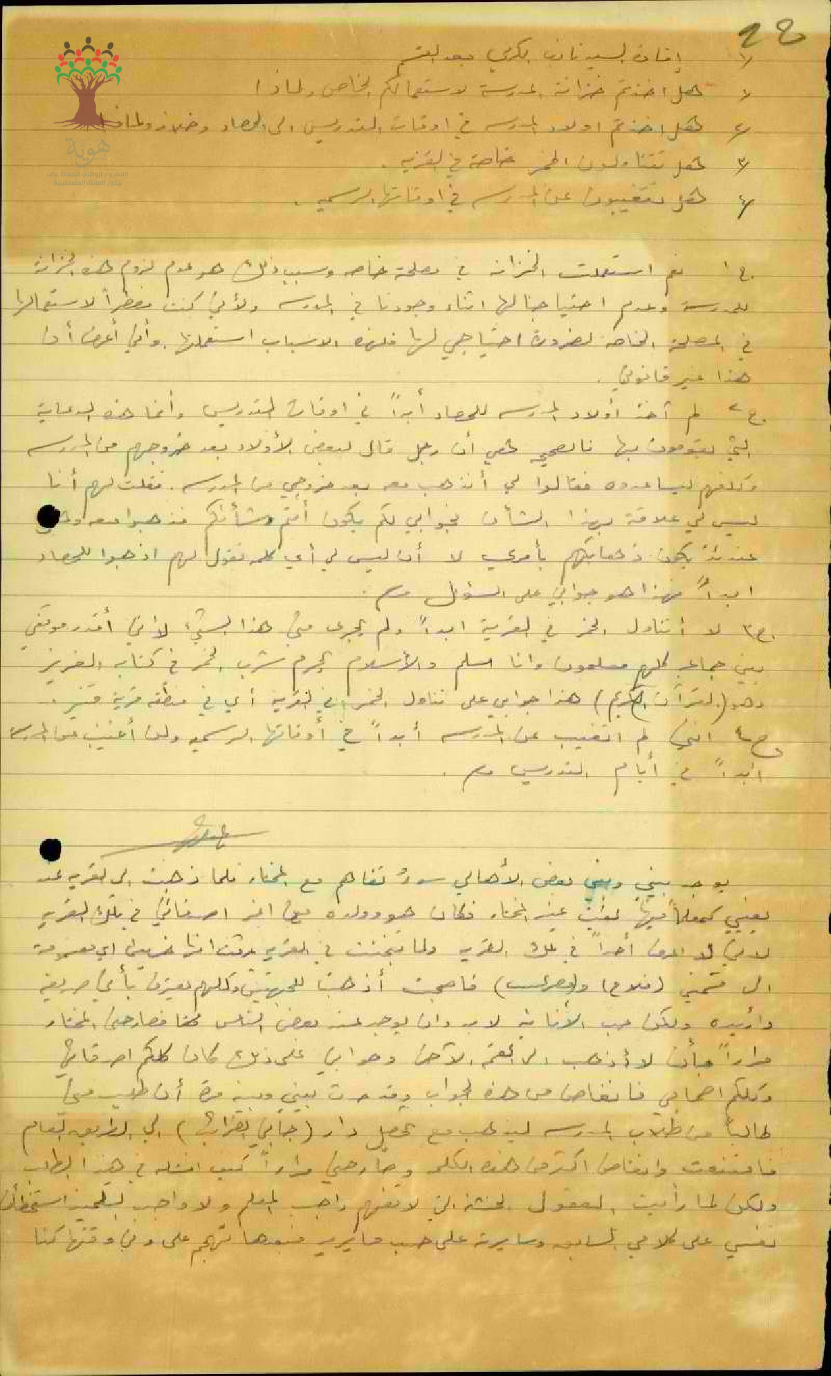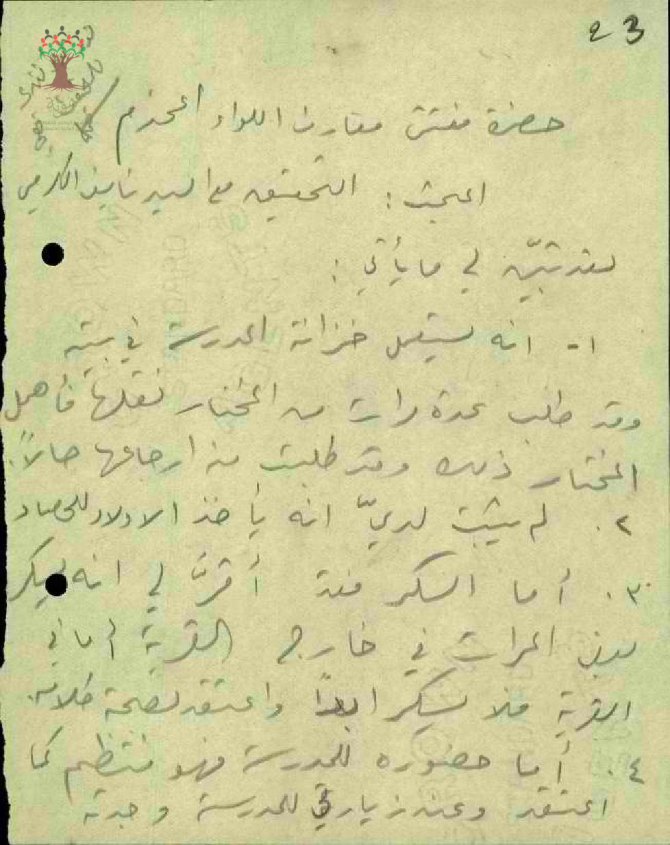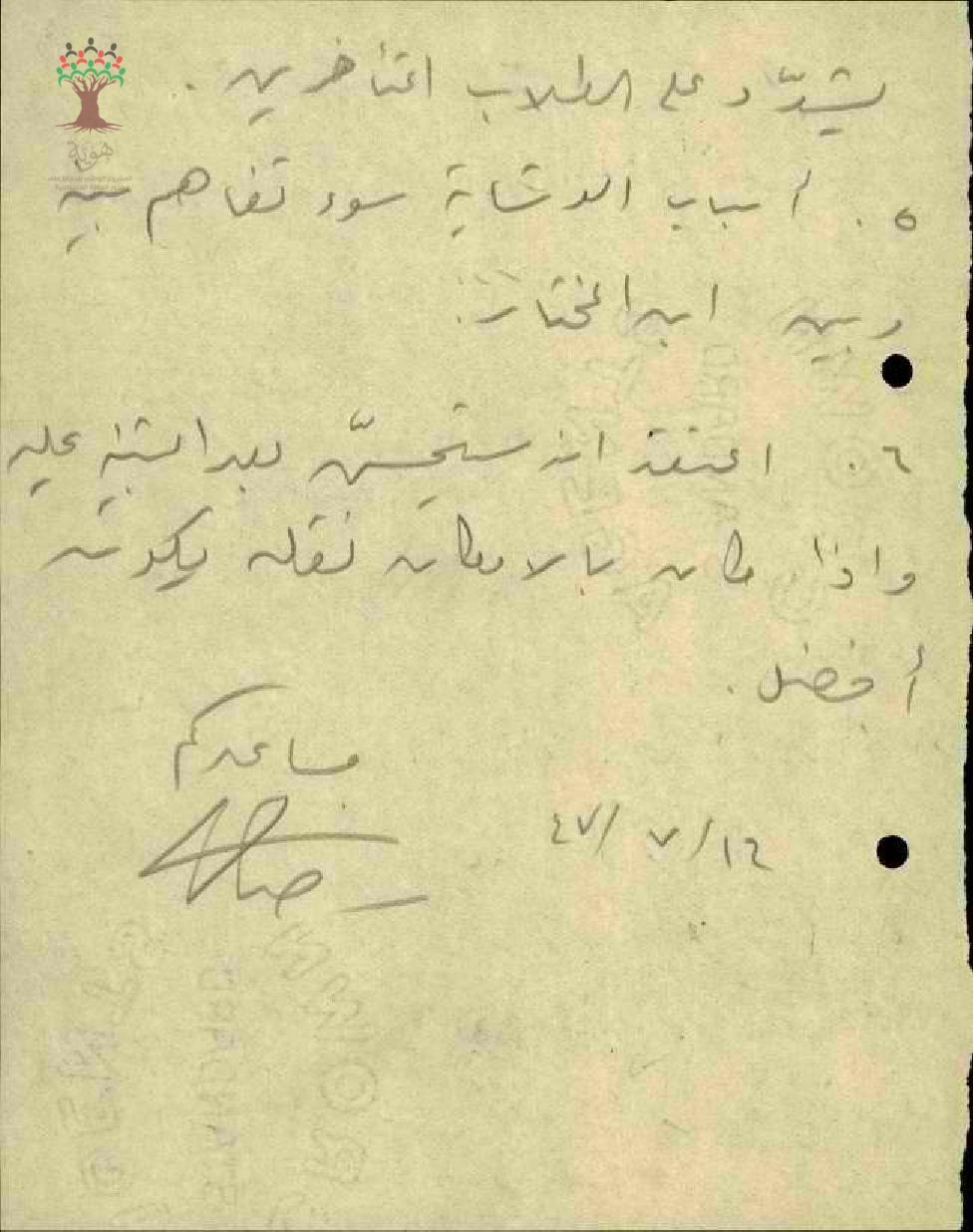 رسالة من مساعد مفتش المعارف إلى مفتش المعارف يبحث التحقيق مع المعلم نايف الكرمي