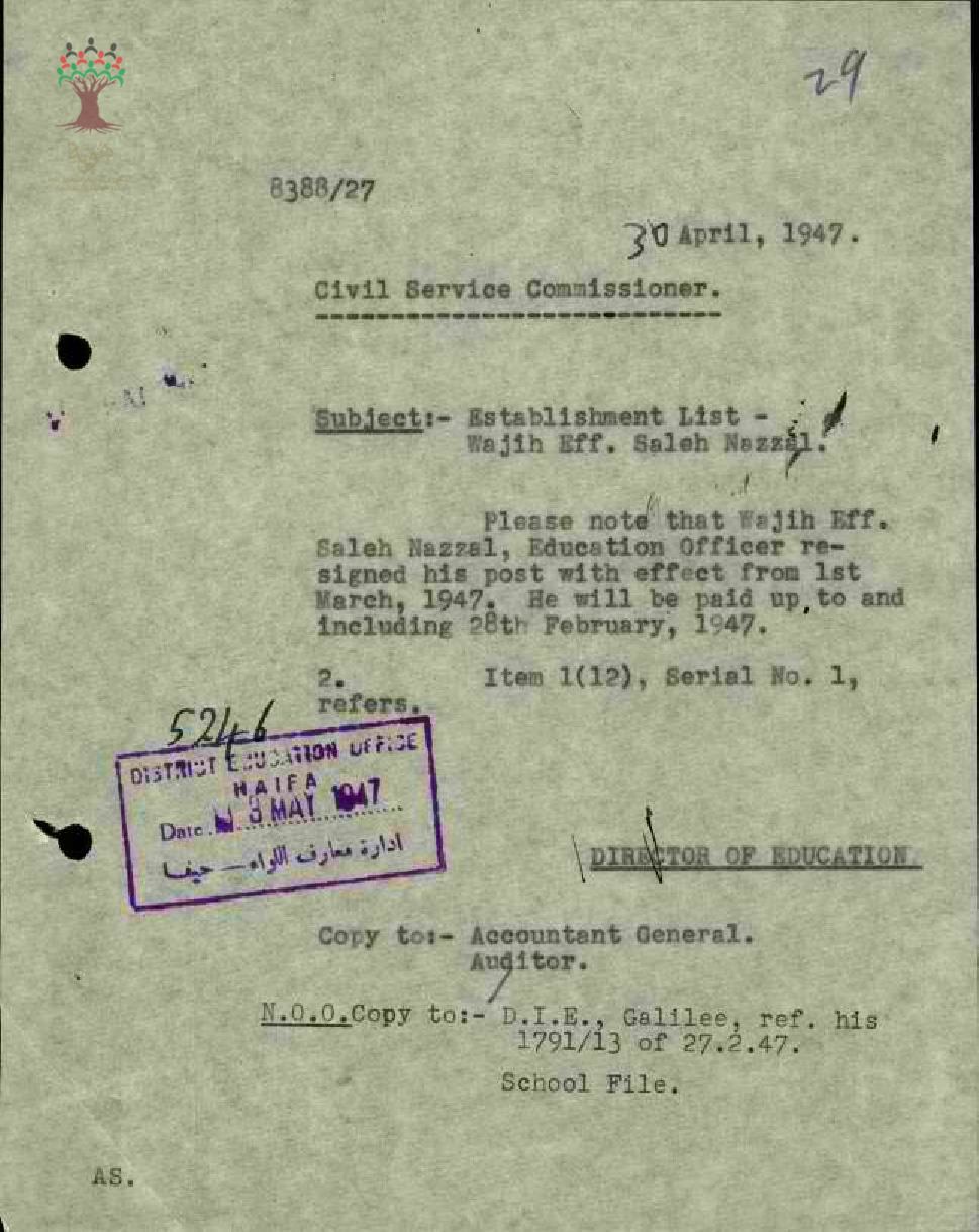 رسالة من مدير المعارف الى مفوض الخدمة المدنية بخصوص إعادة تعيين المعلم وجيه نزال في مدرسة سخنين