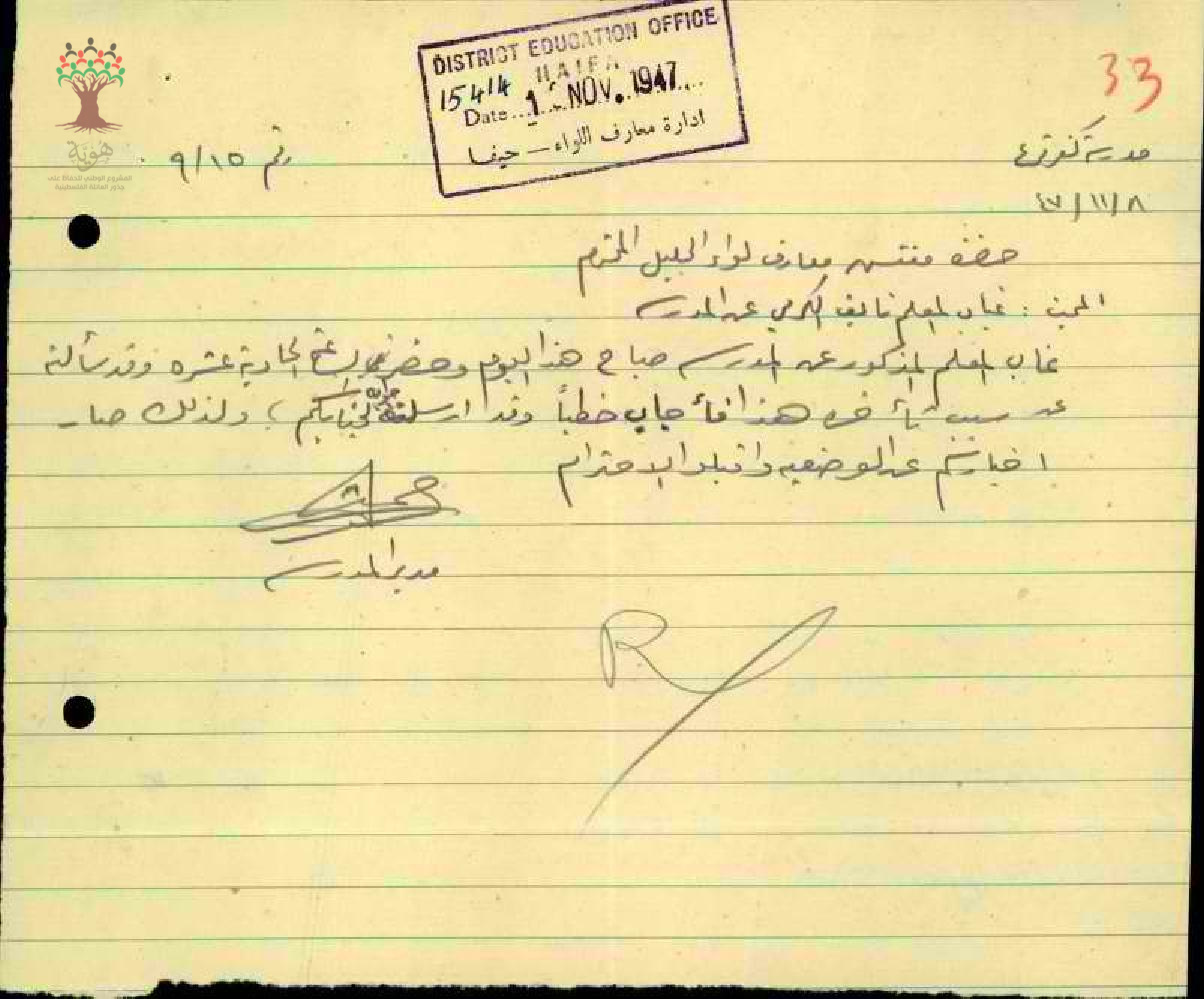 رسالة من مدير مدرسة كفر قرع إلى مفتش المعارف يعلمه بغياب المعلم نايف الكرمي عن المدرسة مع ذكر السبب