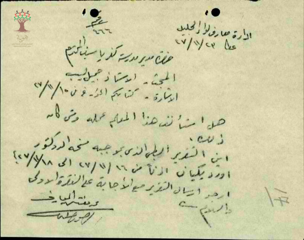 رسالة من مفتش المعارف الى مدير مدرسة كفر ياسيف يسأله عن عودة المعلم جميل خوري الى عمله بعد المرض