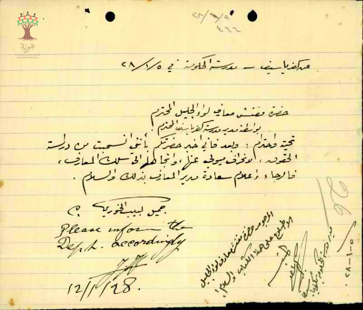 رسالة من المعلم جميل خوري الى مفتش المعارف يعلمه بأنه لم يعد راغبا بدراسة الحقوق