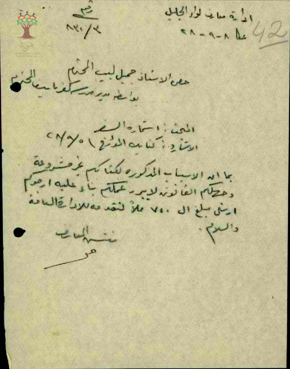 رسالة من مفتش المعارف الى المعلم جميل خوري يطلب منه دفع المخالفة