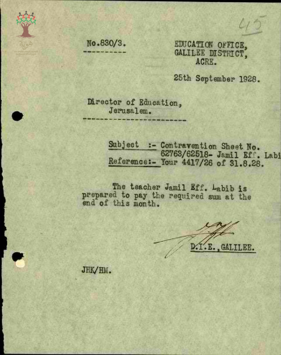 رسالة من مفتش المعارف الى مدير المعارف يعلمه بأن المعلم جميل خوري مستعد لدفع المخالفة