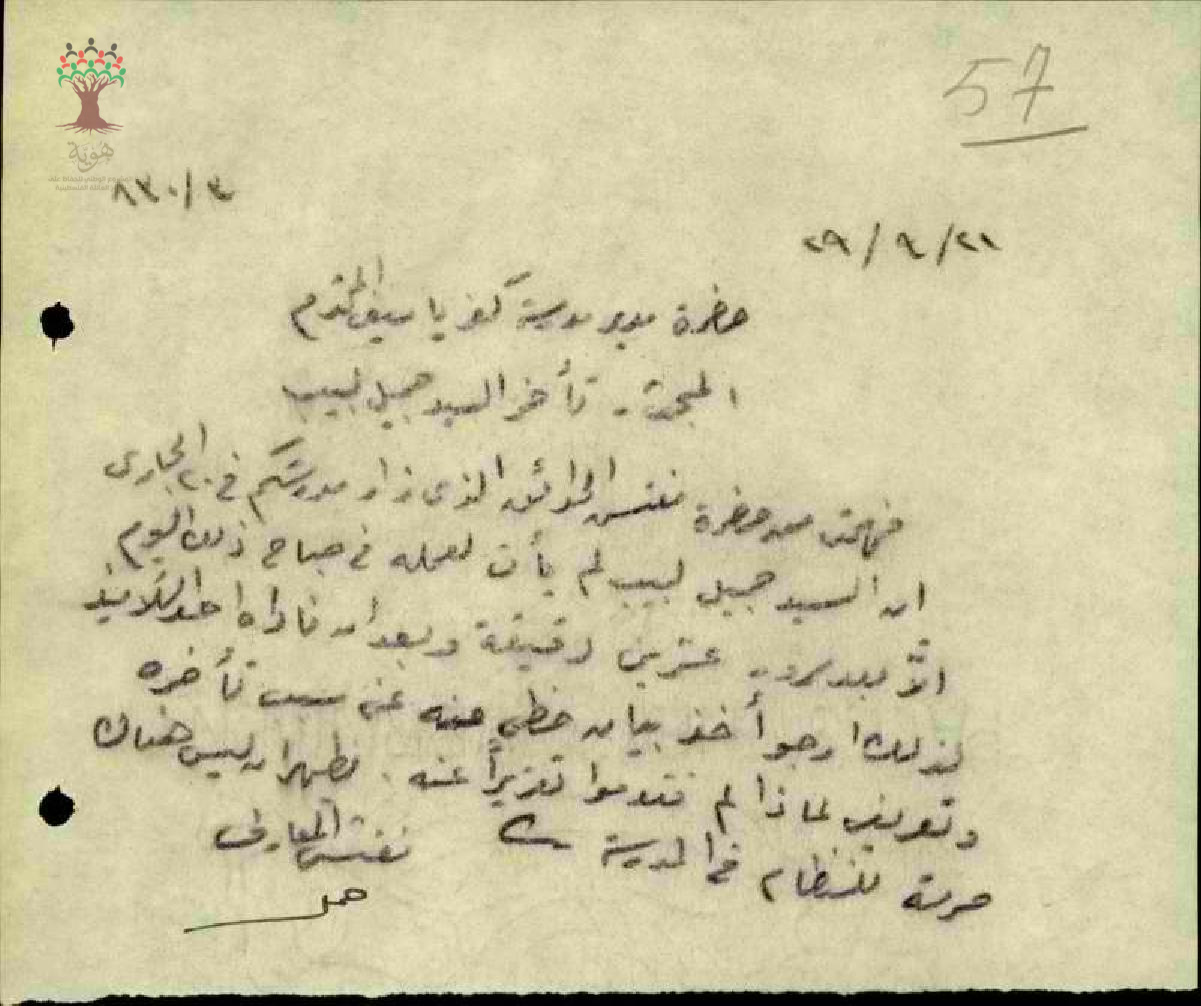 رسالة من مفتش المعارف الى مدير مدرسة كفر ياسيف يسأله عن أسباب تغيب المعلم جميل خوري