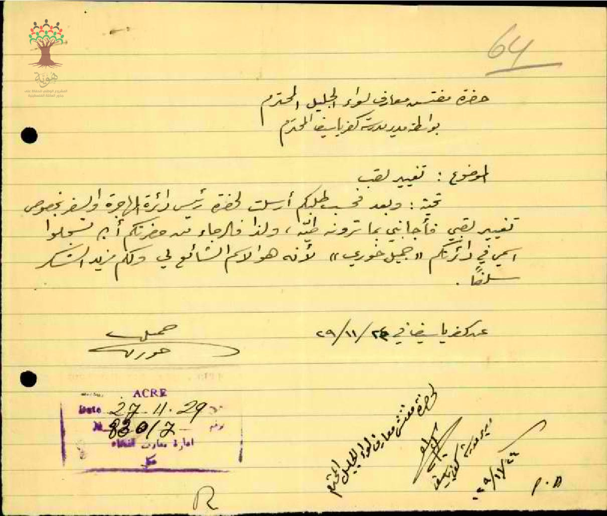 رسالة من المعلم جميل خوري الى مفتش المعارف بخصوص تغيير لقبه