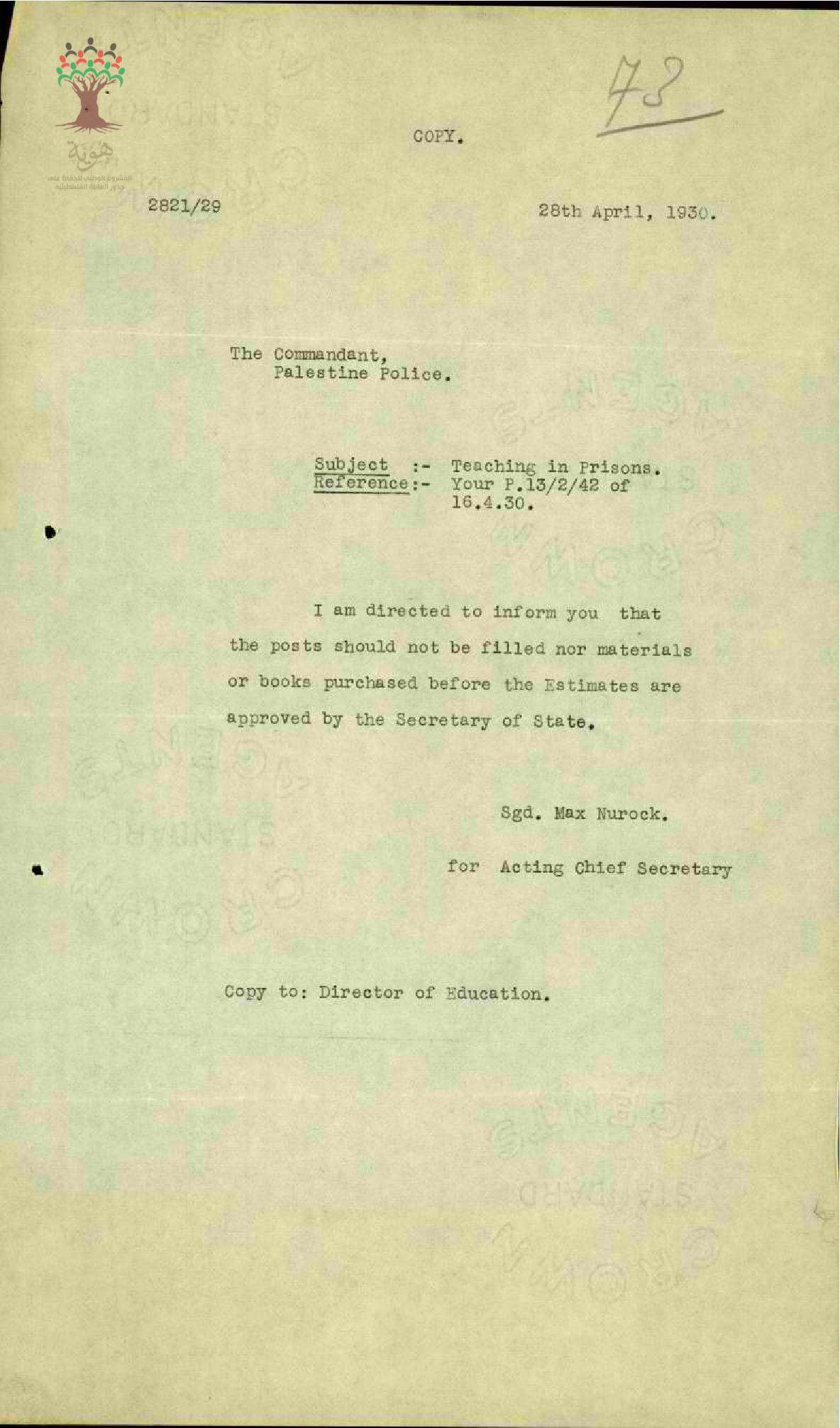 رسالة من مدير المعارف الى مفتش المعارف بخصوص النعليم في السجون مرفقة برسالة رئيس السكرتارية بهذا الخصوص