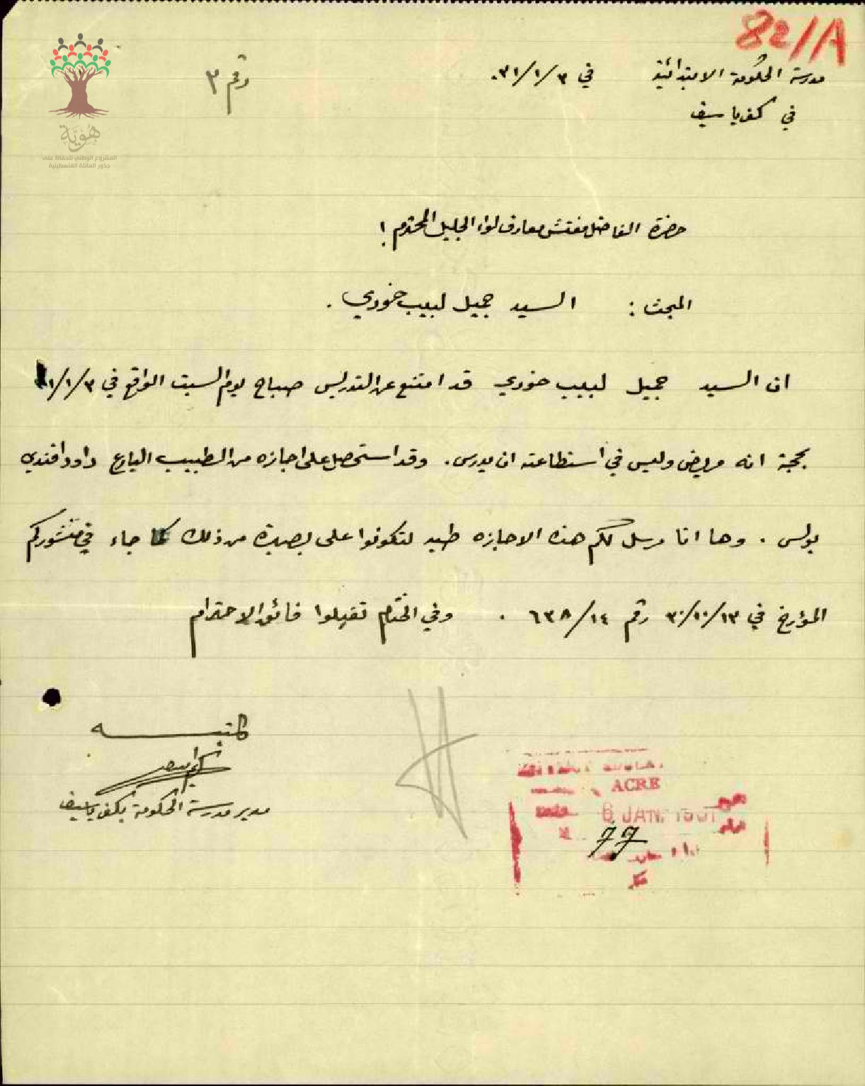 رسالة من مدير مدرسة كفر ياسيف الى مفتش المعارف بخصوص تغيب المعلم جميل خوري بسبب المرض مرفقة بالتقرير الطبي