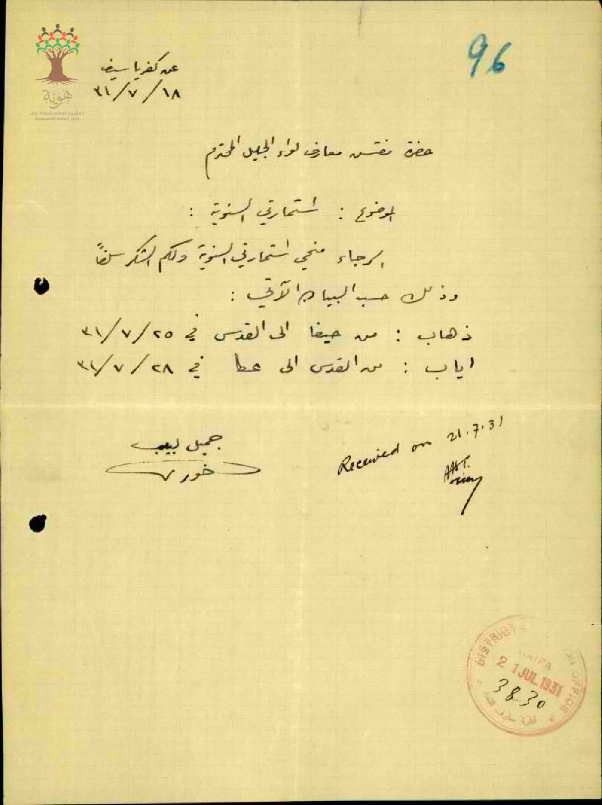 رسالة من المعلم جميل خوري الى مفتش المعارف بخصوص استمارته السنوية