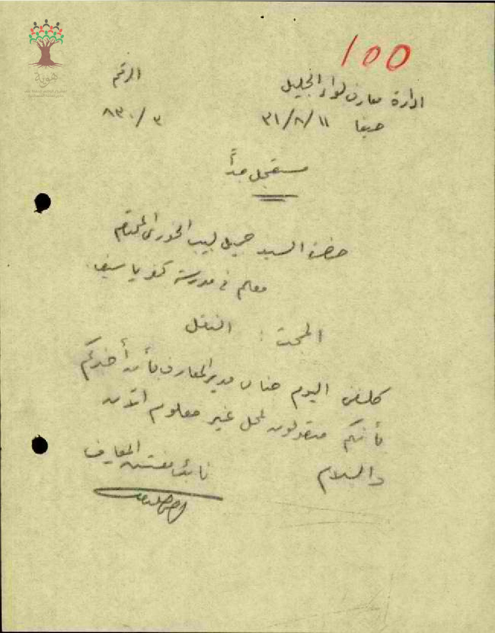 رسالة من نائب مفتش المعارف الى المعلم جميل خوري بخصوص موضوع نقله
