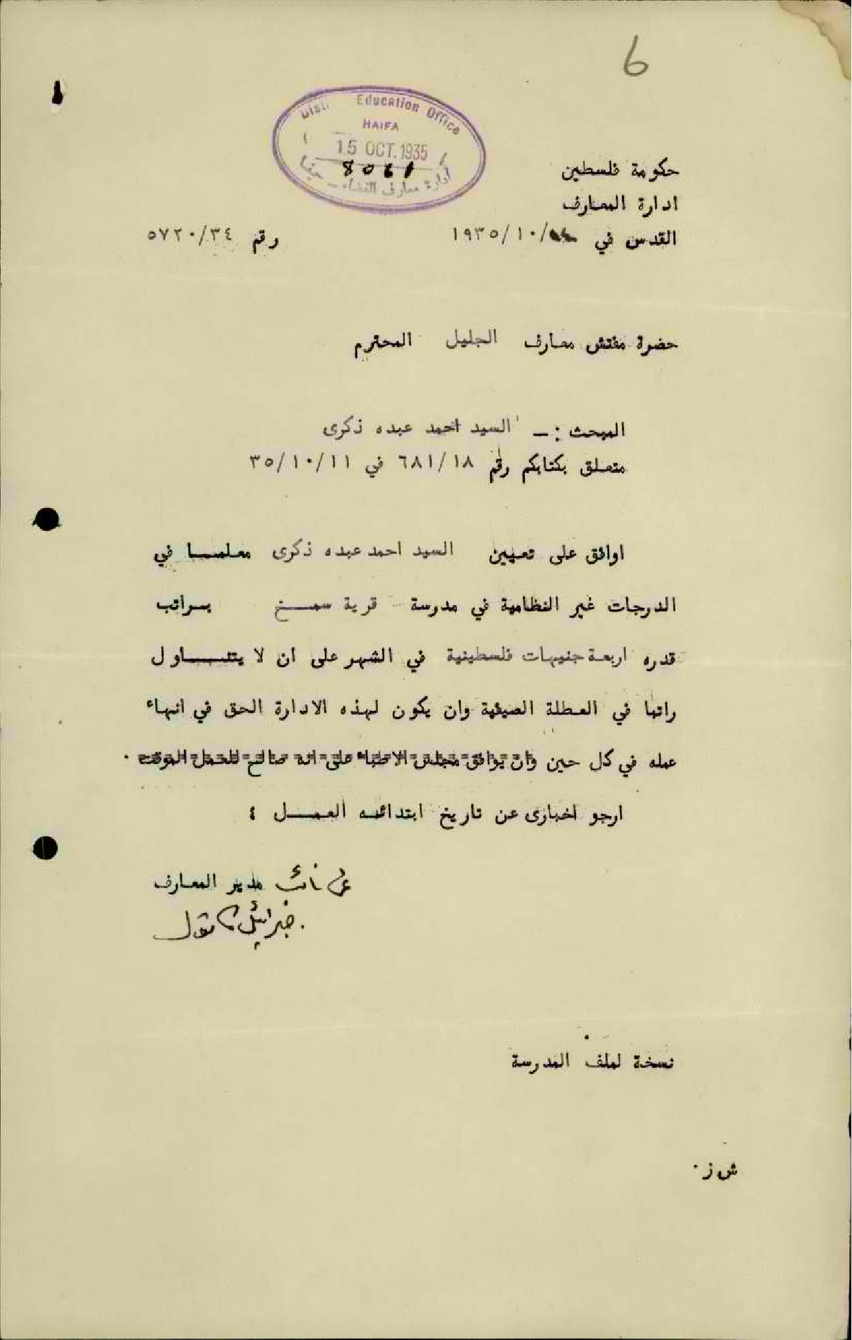 رسالة من نائب مدير المعارف إلى مفتش المعارف يخبره بموافقته على تعيين المعلم أحمد ذكرى في مدرسة قرية سمخ