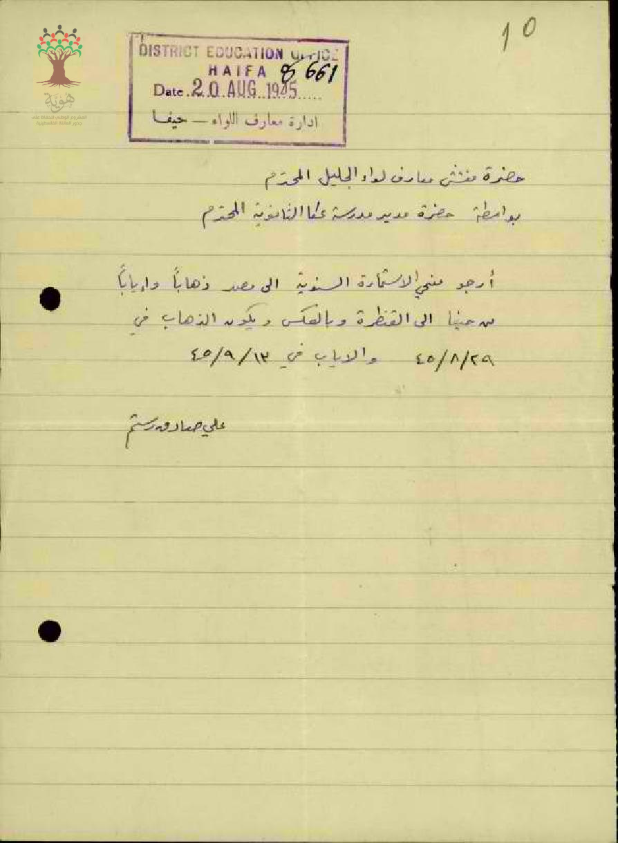 رسالة من المعلم علي رستم الى مفتش المعارف يطلب فيها استمارته السنوية