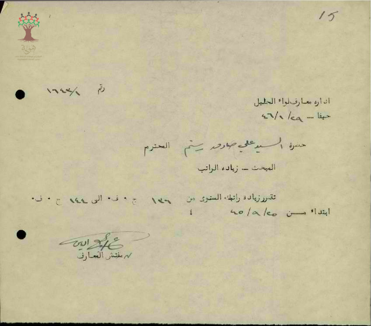 رسالة من مفتش المعارف الى المعلم علي رستم بخصوص زيادة راتبه