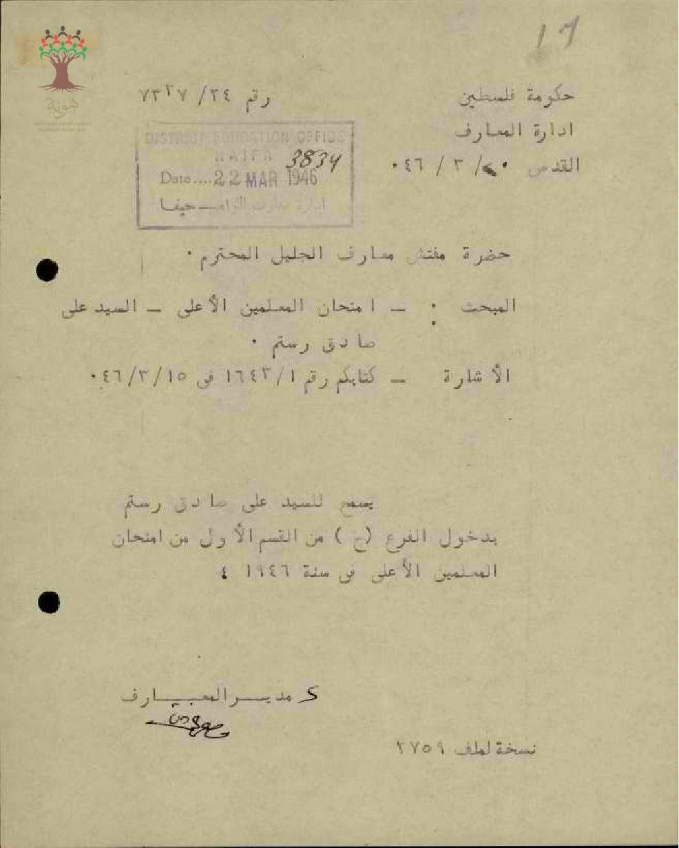 رسالة من مدير المعارف الى مفتش المعارف يسمح فيها للمعلم علي رستم بالمشاركة في القسم الأول من امتحان المعلمين