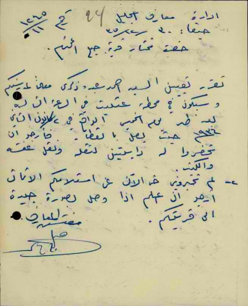 رسالة من مفتش المعارف إلى مختار قرية جبع يخبره بقدوم المعلم أحمد ذكرى إلى القرية