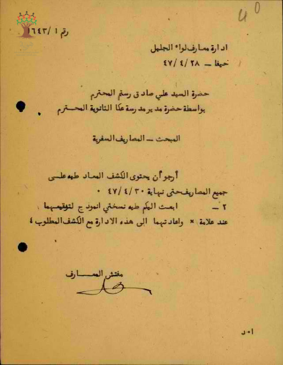 رسالة من مفتش المعارف الى المعلم علي رستم بخصوص مصاريف النقل الى مدرسة الصناعة في حيفا